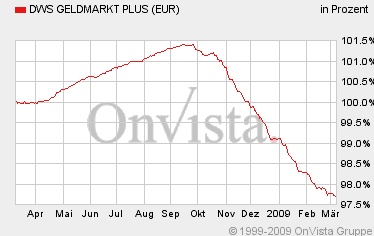 Geldmarktfonds heisst deshalb Geldmarkt, weil er sich wie Tagesgeld/EONIA verhält bzw. diesem sehr schnell annährt. Zumindest solange nicht mit ABS usw. rumgespielt wurde... Genau hier sollte man mE sehr genau hinschauen. ABS sind eine BlackBox mit unvorhersehbarem Risiko.