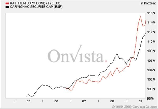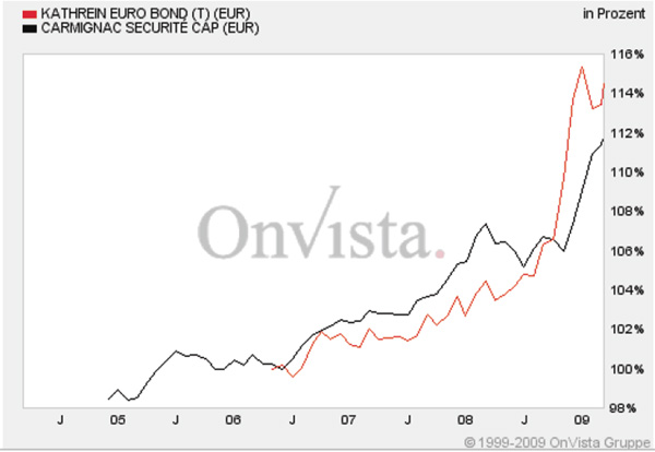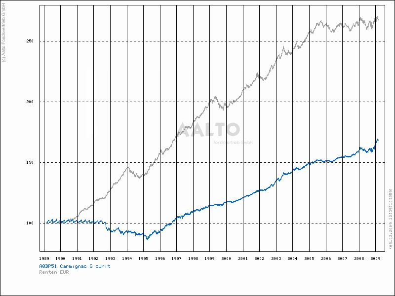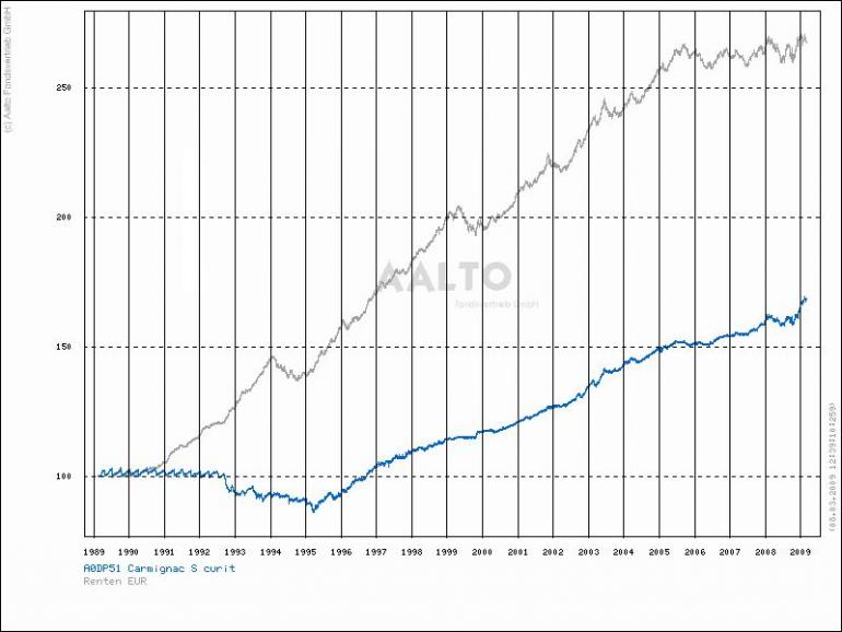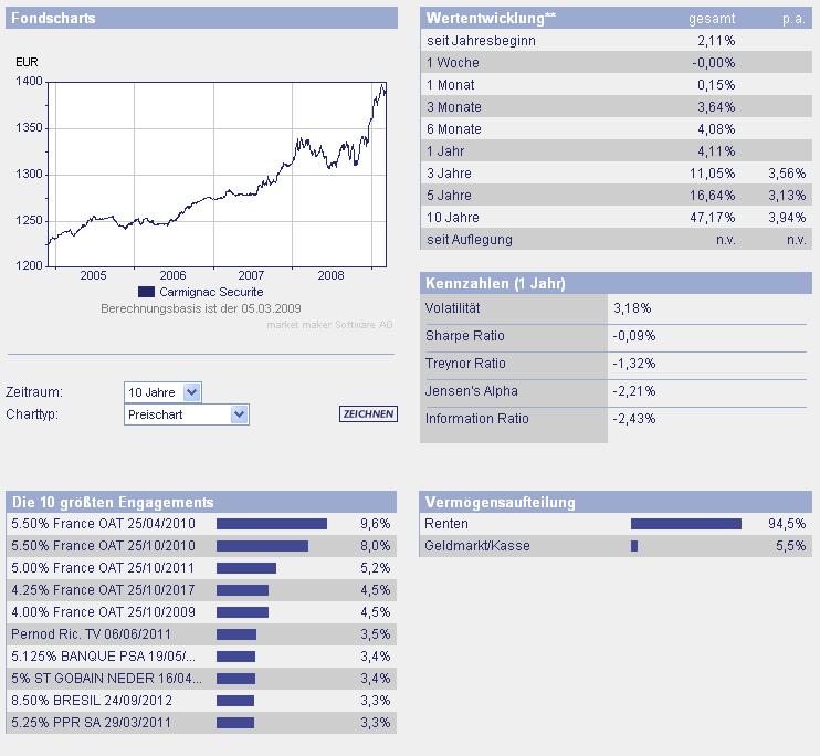 ghost_69 März 8, 2009 Carmignac Securite Ist bei Börse am Sonntag Fonds der Woche. Carmignac_Securite.pdf Daher stelle ich den hier mal ein. Fondsporträt Der Fonds investiert hauptsächlich in Anleihen oder ähnliche Wertpapiere sowie in andere auf Euro lautende Schuldtitel. Sein Ziel besteht darin, eine regelmäßige Wertentwicklung bei gleichzeitigem Erhalt des investierten Kapitals zu erzielen. Basisdaten WKN / ISIN: A0DP51 / FR0010149120 Fondsgesellschaft CARMIGNAC GESTION Fondsmanager Herr Edouard Carmignac Anlageregion Euroland Anlageschwerpunkt Rentenfonds allgemein Benchmark n.v. Risikoklasse 2 Fondsvolumen 446,00 Mio. EUR Auflegungsdatum 26.01.1989 Ertragsverwendung thesaurierend Geschäftsjahr 1.1. - 31.12. Garantie Nein Laufzeit unbegrenzt Kauf / Verkauf Ja / Ja VL-fähig Nein Kosten Ausgabeaufschlag (effektiv) 1,00% (0,99%) Managementgebühr p.a. 1,00% Abwicklungsmodalitäten FFB-Online-Orderschlusszeit 14:00 Preisfeststellung t+0 PPreise vom 05.03.2009 Ausgabepreis n.v. Rücknahmepreis 1.391,00 EUR Carmignac_Securite.pdf Hier mal der Gesamtchart: ... und noch eine PDF von der Gesellschaft: Carmignac_Securite_Fact_Sheet_Januar_2009.pdf Für schwierige Zeiten nicht schlecht, scheint eine Rendite von etwa 3% p.A. zu bringen. Ghost_69 :- Diesen Beitrag teilen Link zum Beitrag