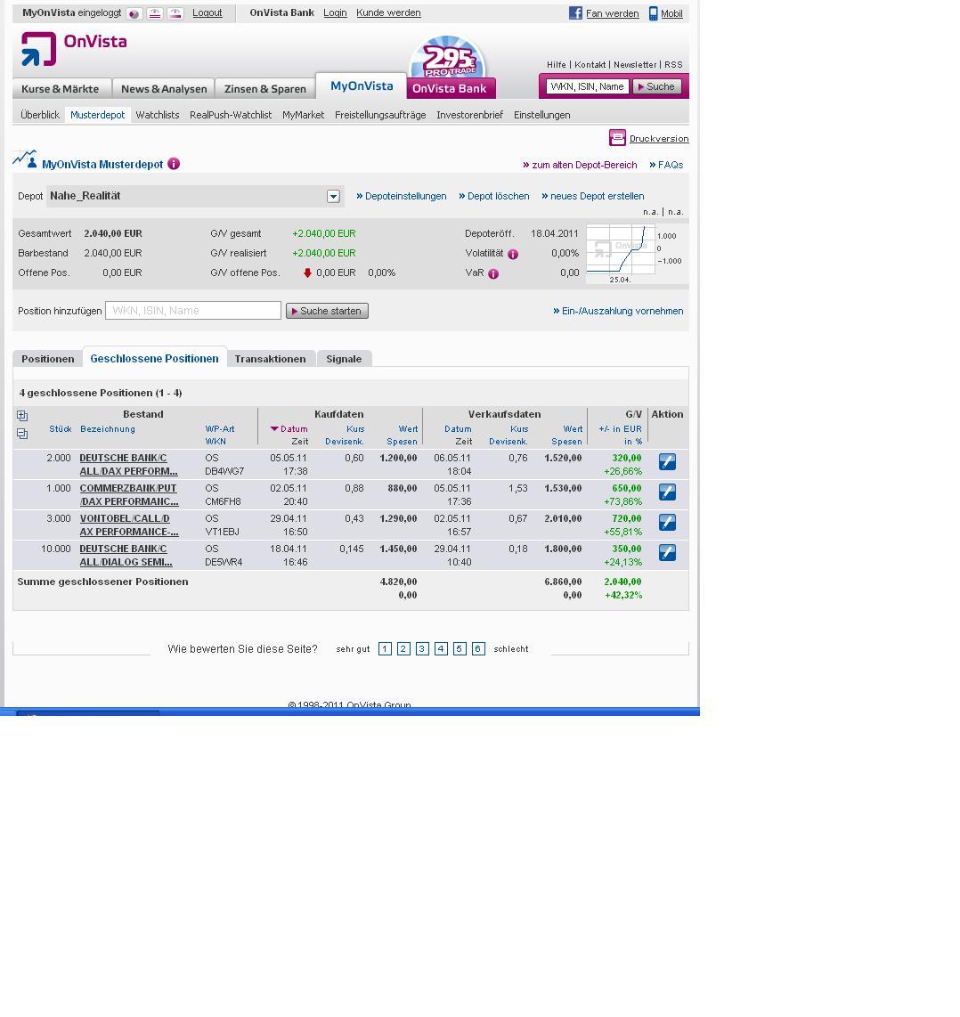 Mr.Price Mai 6, 2011 Jop Markfrau habe ich, hier mal die Transaktionen. Wie du sehen kannst ist es leider ein Musterdepot, hatte das hier aber auch geschrieben.. Mal sehen wie lange das bei Flatex jetzt noch dauert mit der Eröffnung, mit dem Hilfe Chat war ich zufrieden. Diesen Beitrag teilen Link zum Beitrag