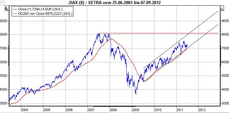 DAX43 Juni 30, 2011 Im Herbst, also August, September kann man sich nochmal neu orientieren, ob sich da ein Trend ausgebildet hat. Wir haben einen Trend. dein Blick ist viel zu sehr auf Tageskurse gerichtet. Im Extremfall sogar Stundenkurse. Wenn du die Augen aufmachst und einen längerfristigen Chart anschaust, dann wirst du erkennen das wir einen wünderschönen Aufwärtstrend haben.Die 200 Tagelinie oder einen Trendkanal traden ist viel entspannter. Diesen Beitrag teilen Link zum Beitrag