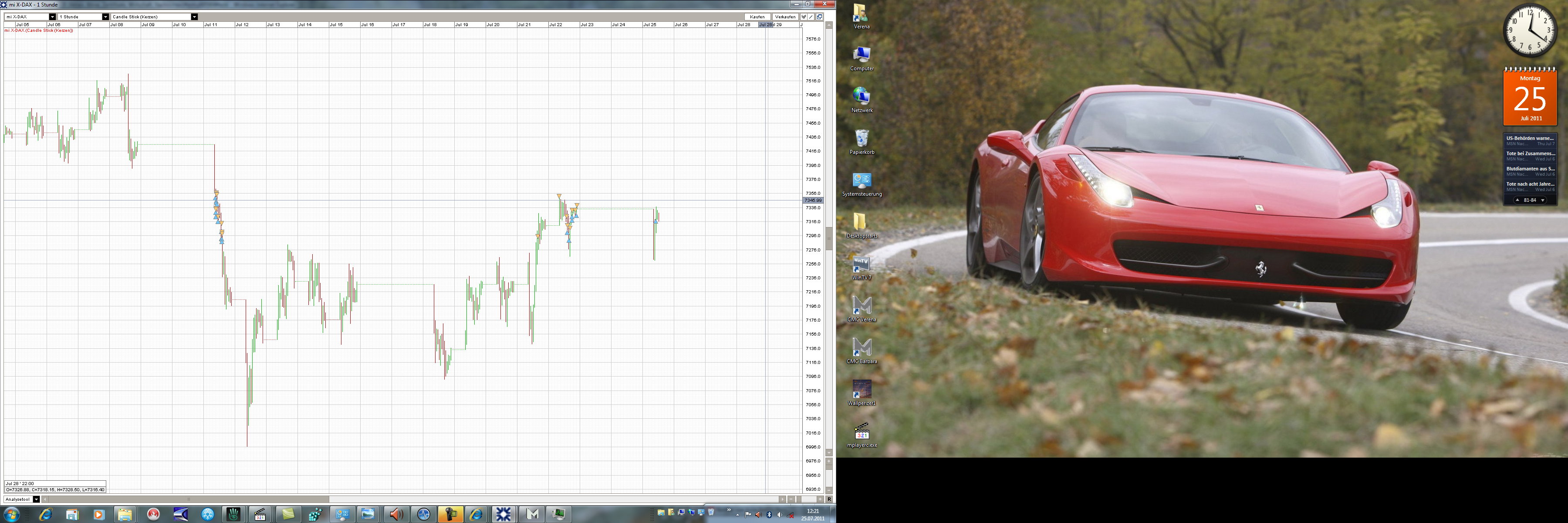 Marktfrau Juli 25, 2011 · bearbeitet Juli 25, 2011 von Marktfrau Aha, na dann rückt der Ferrari auf dem Bild ja in greifbare Nähe . Welches Programm benutzt du da für die Trades? Hier der Kauf bei 7270,3 bei CMCmarkets hete morgen und Verkauf bei 7322 Und hier meine S&P500 Trades. Auch so gut wie kein Minustrade - allenfalls 1,2 oder 3 kleine Minustrades, so genau weiß ich das nicht mehr. Daneben habe ich noch auf 2 weiteren Konten S&P getradet mit gleich guten Ergebnissen. Letzte Nacht eine Nasdaq Position nach dem Absturz der US Indices. Leichtes Plus kurz danach realisiert. Spektakulär vom Punktegewinn sind die Trades nicht. Sie waren eher Verteidigungsstrategie nach den Rating-Agentur Attacken. Gute (Punkte-)Gewinne habe ich zwischen dem 1. und 11. Juli gemacht, als ich bullisch gesetzt hatte und auch 500 Punkte aufwärts kamen. Weitere trades werde ich vorerst nicht veröffentlichen. Diese Nachweise sollen dazu dienen, zu zeigen, daß daytrading nicht nur Glück, sondern Arbeit ist und ich meine trades nicht erfinde oder Verluste als Gewinne darstelle. Diesen Beitrag teilen Link zum Beitrag