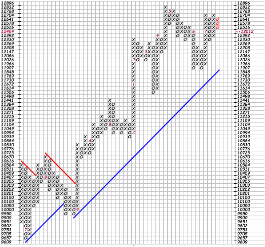 Weitgehend kommentarfrei stelle ich mal einen P&F Chart des DJIA ein. Wie man erkennt sollte gerade die kurzfristtrader ein Rückgang nicht sonderlich verwundern, so man an Charttechnik glaubt. Den Rest kann ja jeder selbst sehen. (aber ich habe die Befürchtung, für die meisten sind P&F Charts ähnlich wie chinesische Schriftzeichen. ;) )