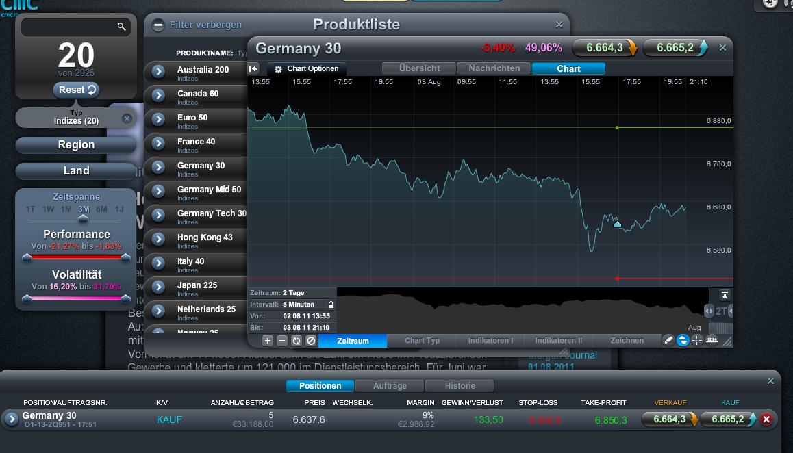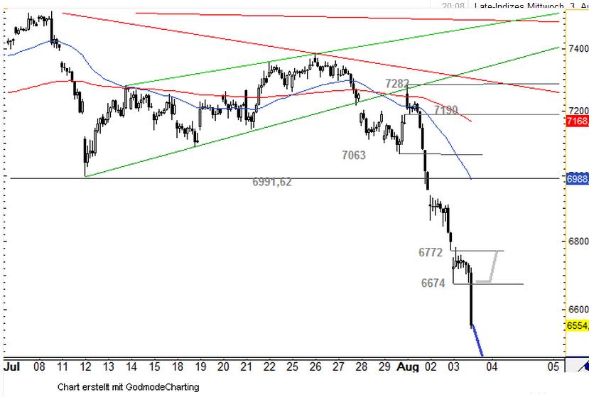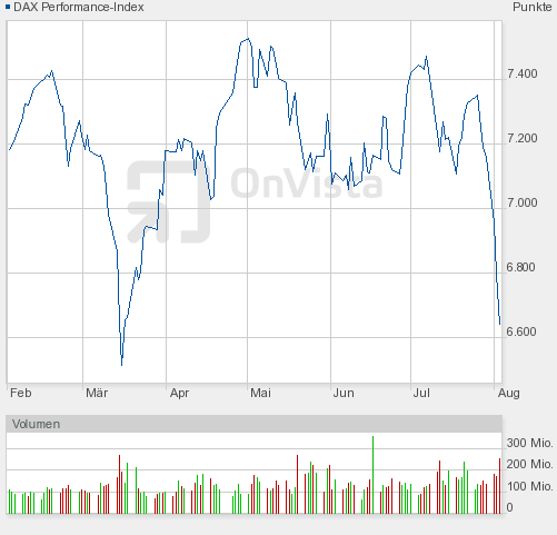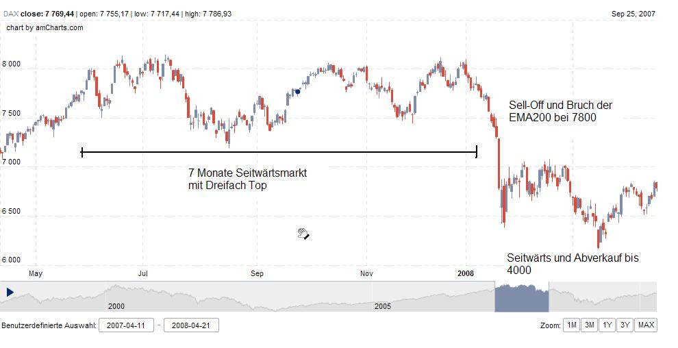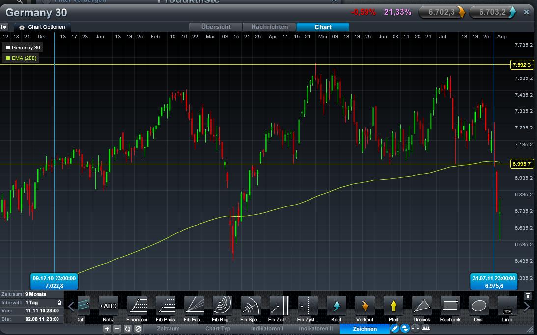 Hobel August 3, 2011 · bearbeitet August 3, 2011 von Hobel Natürlich ist das ein Demokonto, Heute 400 gemacht...... nur mit der Auszahlung wird es schwierig. Für Anlagen ist das Ding völlig ungeeignet, nur CFD Handel eben. Ein Frankfurter Aktienhändler brachte die nervöse Marktlage auf den Punkt: „Der Markt ist komplett durchgedreht. Gestern bin ich eine Zigarette rauchen gegangen und als ich zurückkam, war der Dax um 70 Punkte gefallen. Ich komme gerade aus meiner Zigarettenpause zurück und der Markt ist 100 Punkte gefallen - ich sollte wohl das Rauchen aufgeben." Und du wirst schon wieder leichtsinnig, weil die Märkte wieder hochgekauft wurden und die 8 Tage abwärts beendet haben. Natürlich ist da was faul, nicht umsonst werden Abermilliarden umbewegt. Was dem DAX fehlt ist das ausländische Kapital, was abgezogen wurde. Die Amis holen ihr Geld nach Hause !!!! Repatrierung nennt man das, weil sie zu Hause Kredite bedienen müssen. Das wird sich irgendwo zwischen 6500 und 6900 wohl stabilisieren aber die 7000 sind erstmal Geschichte und der Bruch der EMA200 war bisher immer ein todsicheres Zeichen für einen Bärenmarkt, abgesehen von Fukushima. Bleiben wir unter 7000 kannst du dich von Long verabschieden und mit einer Vola von 200-300 Punkten pro Tag anfreunden. Jedes längere Long Investment wird früher oder später doch ausgestoppt werden.Das hatten wir aber schon die letzen Monate auch. Hier nochmal der Crash von 2008.... und zum Vergleich die jetzige Lage Diesen Beitrag teilen Link zum Beitrag