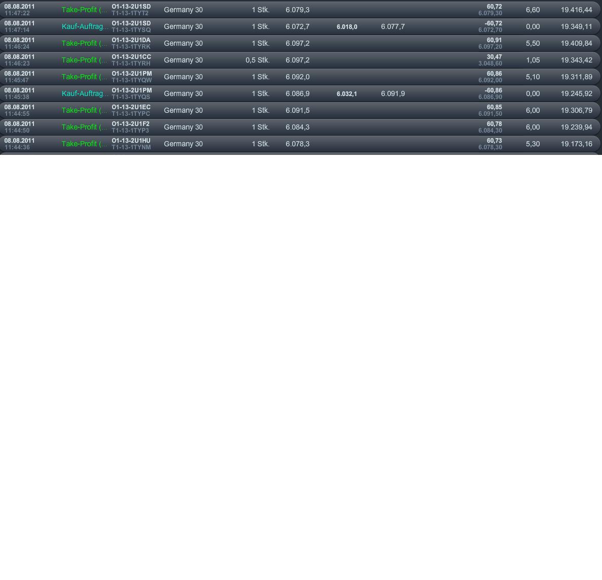 Erik88 August 8, 2011 · bearbeitet August 8, 2011 von Erik88 Habe soeben meine ersten 6,50€ mit CFDs gewonnen Bin gespannt wie es heute weitergeht - die 6100 nach unten scheinen ja erstmal zu halten. Edit: Und weit runter... Diesen Beitrag teilen Link zum Beitrag