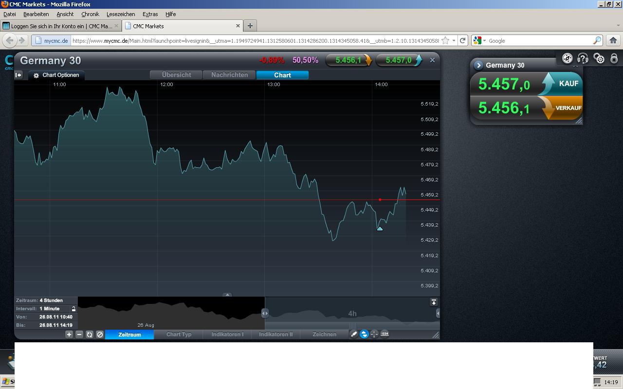 Sthenelos August 26, 2011 · bearbeitet August 26, 2011 von Sthenelos Nochmal geshortet und SL nachgezogen Edit. und raus bei 5427 und long edit: long edit 13:51 long ausgestoppt bei 5448, hatte SL immerwieder nachgezogen Diesen Beitrag teilen Link zum Beitrag