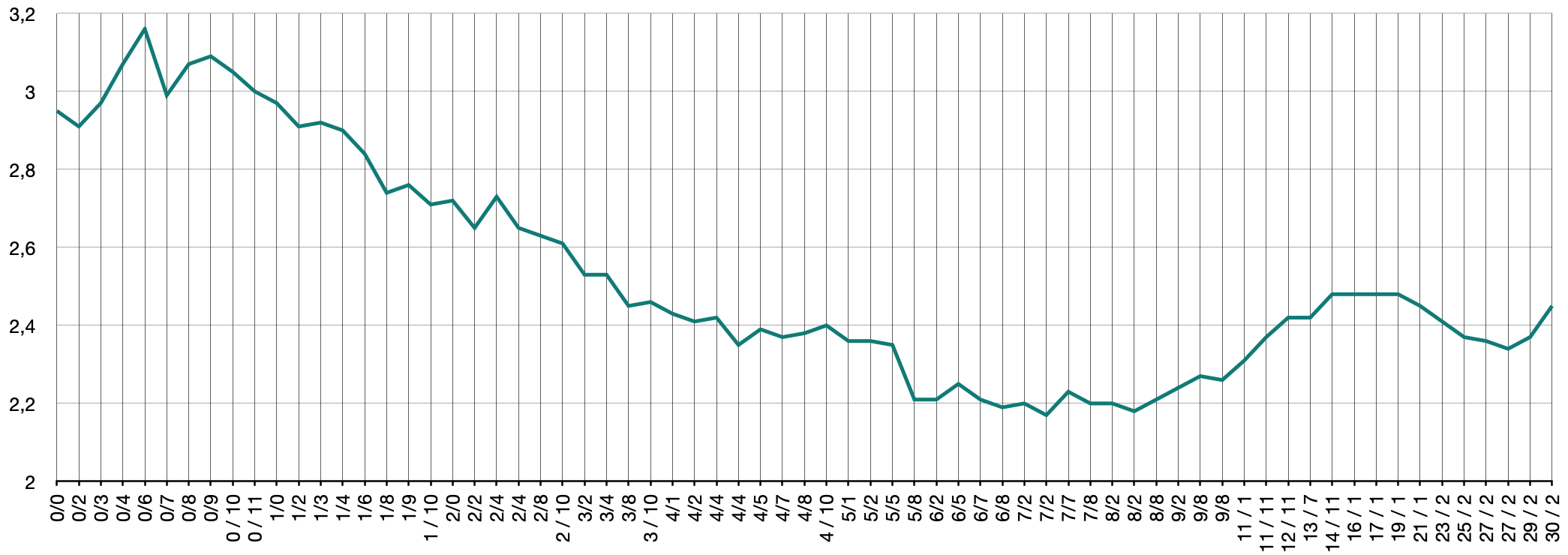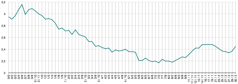 The bid-to-cover ratio landed at 1.4, signalling weaker demand than in the previous 10-year bund auction, which had a bid-to-cover ratio of 1.5. Overall bids amounted to €5.6 billion, comprised of €2.2 billion coming from competitive bids, with investors setting their desired yield and discount rate, and €3.3 billion coming from non-competitive bids.