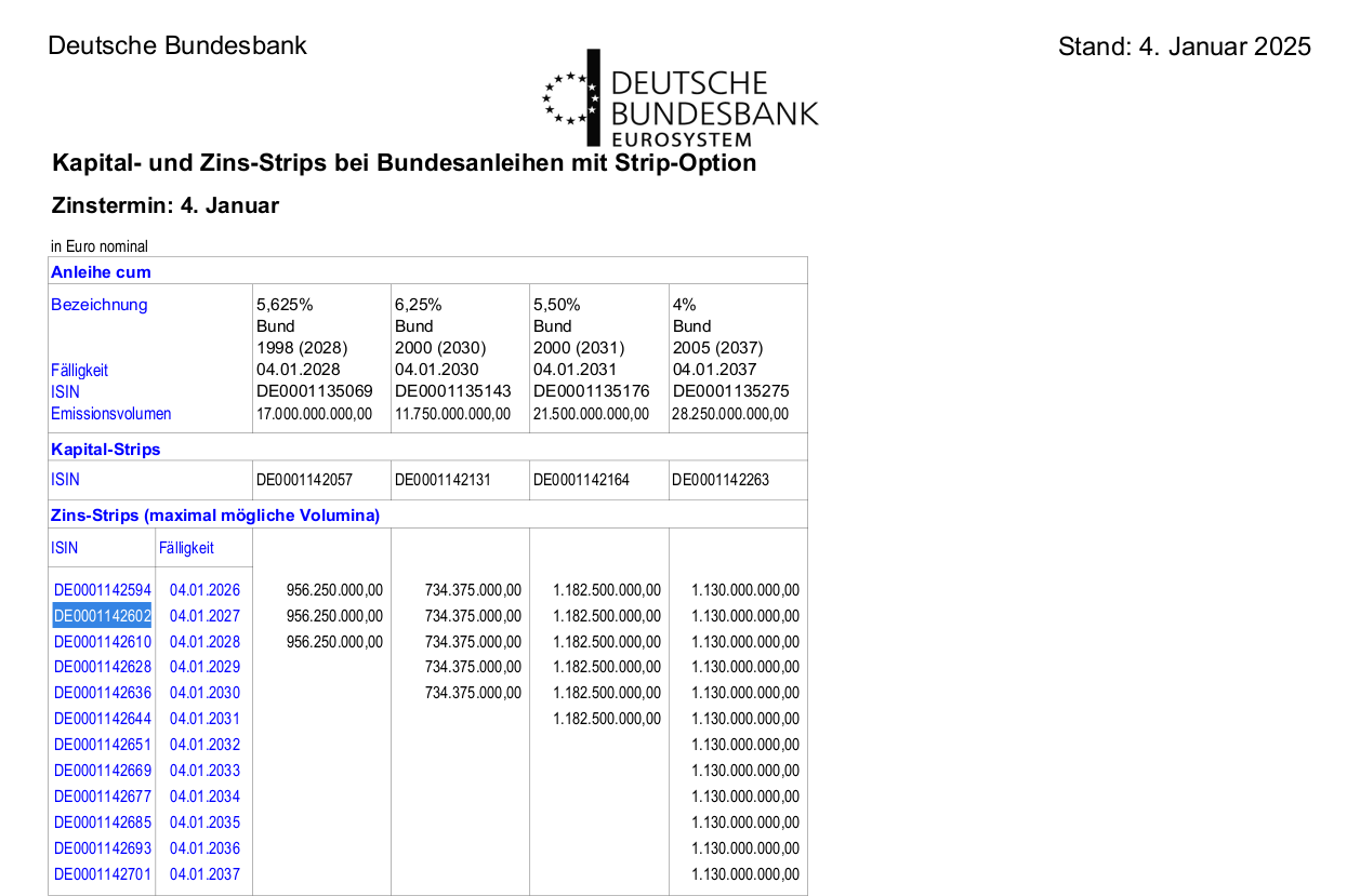 Das Hauptproblem dürfte wohl wirklich die mangelnde Liquidität sein. Wenn ich es richtig sehe, wurde der Zins-Strip in Frankfurt zuletzt am 04.06.2025 gehandelt, und zwar 10.000 Euro nominal für 98,50 %. Zu diesem Kurs kommst du nicht mal auf ein Prozent Rendite...