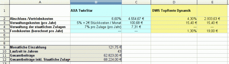 KaterGonzo Mai 21, 2009 Also, ich melde mich nach tagelanger Einarbeitung wieder mal zurück. Leider bin ich mir immer noch unschlüssig. 1.: Frage zum Thema Verwaltungskosten Auszug Schreiben Kostenentwicklungen: "Die Abschluss und Vertriebskosten werden während der ersten 5 Jahre erhoben. Sie werden über einen Faktor aus den laufenden Beiträgen ermittelt, welche im wesentlichen von der Aufschubdauer (Zeitraum Versicherungsbeginn bis zum vereinbarten Rentenbeginn) abhängt. Der Faktor wird wiefolgt berrechnet: (0,375 + 0,042 * (43 - 15)) * 0,4 = 0,6204 In Ihrem Vertrag bedeutet dies: 121,74 EUR Monatsbeitrag * 0,6204 = 75,73 EUR" Hier kommen also meine Gesamt Abschluss und Vertriebskosten (12*5*75,73 = 4543,80) her. Wenn man davon ausgeht, dass die Gesamteingezahlten Beiträge inkl. staatlicher Zulagen rund 68200 Euro sind, entspricht dies 6,6% Abschluss-/Vertriebskosten! Das ist doch mal ziemlich heftig, oder? Wie kommt die obige Formel zusammen? 43 = Beitragsjahre, aber der Rest??? 2.: Alternative DWS TopRente Ich habe diesen Beitrag hier im Forum gefunden, der die Kosten der DWS TopRente (Fondssparplan) gut auflistet. Ich habe mich mal an diesem PDF-Dokument von DWS gehalten, lediglich die Werte mittels diesem Online-Rechner angepasst. Hier mein persönlich gestalteter Vergleich beider Produkte: Sind die Daten korrekt? Oder liege ich völlig daneben? Die DWS TopRente ist ja deutlich billiger und hat (laut Euch) einen besseren Fonds. - Vertriebs/Abschlusskosten deutlich niedriger (wobei dieses nach dem Wechsel gen Null gehen wird, da mein jetziger Vertrag ja schon 18 Monate läuft) - Verwaltungskosten sind bei DWS lediglich die Depotkosten, richtig? Auch deutlich billiger! - DWS hat keine Verwaltungskosten für die staatlichen Zulagen? - Dafür muss ich bei der AXA keine AA auf die Fonds zahlen. Ich bin für Eure Ratschläge absolut dankbar! Je mehr ich lese, desto verwirrender wird es irgendwie. Überlege schon, den Vorschlag bwzüglich Banksparplan zu machen, was aber für einen 26 Jahre alten Kerl für mich nicht profitabel zu sein scheint. Diesen Beitrag teilen Link zum Beitrag