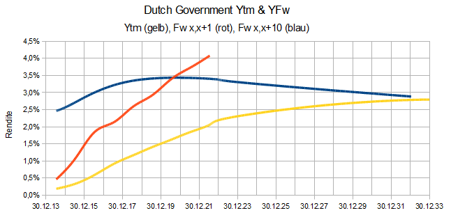 vanity August 30, 2013 Notiz: die letzten Beiträge sind aus dem Transaktions-Kommentarthread ausgelagert! Für Leseratten: Aufstellung aller Aegon-Tiere gibt's bei Aegon! (samt Prospektmaterial) Hier eine (etwas platte und ungenaue) Abschätzung der 10y-Forward-Renditen (blaue Kurve) auf Basis der aktuellen Renditen (gelbe Kurve) von NL-Sovereigns. Die Messpunkte werden gegen Ende mangels geeigneter Papiere etwas dünn, aber die Tendenz ist zu erkennen. Stairway kann das mit seinen erweiterten Mitteln ja noch etwas genauer rechnen. (rote Kurve: Forward 1y, in unserem Kontext uninteressant) 2015 wären wir dann unter 3%, etwa bei 2,7%, Fixing der NL0000120004 wäre um 3,5%. Das dürfte deren niedrigen Kurs erklären. Ab 2018 läuft die 10y-Forwardkurve dann ziemlich horizontal im Bereich 3,3%. Ob 2018 oder 2021 die bessere Wahl ist, lässt sich kaum beantworten. Die aktuellen Kurse lassen vermuten, dass an einen Call weder zum einen noch zum anderen Termin zu denken ist (Ytm wäre dann gigantisch), eine Prämie von 85 Bp bei Reset nur alle 10 Jahre ist auch sehr bequem für Aegon. Mein Vermutung geht dahin, dass die 2018er bei sonst eher unverändertem Umfeld (insbesondere der Risikoeinschätzung zu Aegon) bis zum nächsten Reset-Termin noch Kurspotenzial nach unten hat (10 Pp?) und sich damit ihr derzeit hoher Kupon deutlich relativiert. Müsste ich mich für ausschließlich eine entscheiden, wäre die 2021er (NL0000120889) für mich erste Wahl. Handelsplatz ist vorzugsweise AMS, wo man mit der WKN nicht weit kommt. Deshalb hier noch die entsprechenden ISIN. WKN - ISIN - akt. Kupon - Reset - akt. G/B-Spanne AMS akt. CY 128531 = NL0000120004 4,16% bis 2015 62,3/62,9 6,6% 134182 = NL0000121416 5,19% bis 2018 78,2/78,4 6,6% 131247 = NL0000120889 4,26% bis 2021 69,2/69,5 6,1% Diesen Beitrag teilen Link zum Beitrag