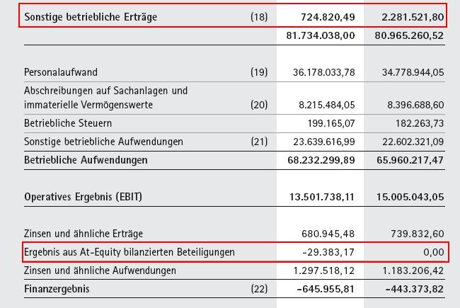 Stairway Februar 21, 2010 · bearbeitet Februar 21, 2010 von Stairway Hallo Valeron, Hallo Stairway, noch eine Frage: unter welcher GuV Position verbergen sich die Einnahmen, eines Unternehmens, die nicht aus "Warenumsatz" bzw. Verkauf entstanden sind. Große Unternehmen halten ja zum Teil Aktien, Immobilien und andere Finanzinstrumente, deren Dividene/Einnahmen irgendwo in der GuV auftauchen müssten. Dafür gibt es diverse Postionen, ein kurzer Überblick: Dividendenertäge werden in der Regel im Finanzergebnis ausgewiesen, genauso z.B. Wertsteigerungen durch Aktien die man im Umlaufvermögen zum fair value hält (da hat jede Rechnungslegung diverse Vorschriften.) Am Beispiel der Swatch Group siehst du zum Beispiel: Da taucht z.B. eine Position "other financial income and expense" auf. Diese beinhält die Wertschwankungen eines Aktienpaktes der Swatch Group an einem chinesischen Uhrenhänlder (sehr gutes Unternehmen übrigens). Der Kursfall (im Vorjahr: Anstieg) dieser Aktien muss natürlich irgendwie berücksichtig werden und da die Aktien eben im Umlaufvermögen klassifiziert wurden taucht die Position in der GuV auf, wird aber in der CF Rechnung wieder herausgerechnet, da es sich "nur" um Buchverluste handelt. Des weiteren siehst du zwei Positionen darunter "share of result from associates and joint ventures", das sind also Erträge aus Beteiliungen unter 25 % bzw. JVs. Im Anhang ist das dann genauer aufgedröselt: Anders Beispiel ist A.S. Creation: Dann gibt es noch betriebsfremde Ertäge wie Anlagenverkäufe (z.B. Immoverkäufe) die werden zum einen im "sonstigen betrieblichen Ertrag" erfasst (wie in der Grafik oben) oder als extra Position ausgewiesen wie du hier d'runter siehst: Allgemein gilt noch (hier gibt es aber Abweichungen je nach Rechnungslegung und Wahlrechten), dass du bei kleinen Aktienpositionen nur die Dividenden als Erträge buchst, bei Beteiligungen unter 50 % den entsprechenden Anteil am Gewinn und bei Beteilungen von über 50 % die gesamte GuV übernimmst und die Fremden Anteile dann zum Schluss unter "Anteile anderer Gesellschafter" wieder herausrechnest. So, ich hoffe das ist so verständlich Grüße Diesen Beitrag teilen Link zum Beitrag
