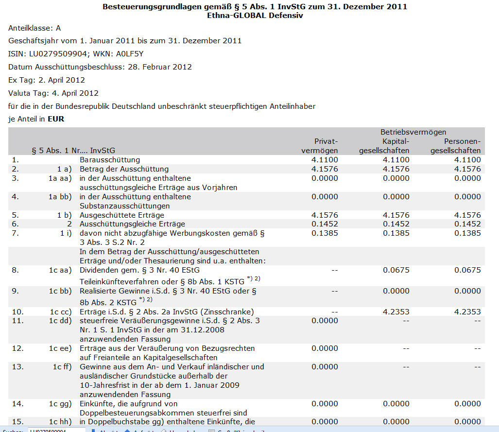 Frankman77 Februar 16, 2013 Mal eine Frage zur Besteuerung vom Ethna Defensiv: Der Ausschüttungstermin ist ja nicht zum Geschäftsjahresende, und im Bundesanzeiger ist folgendes für letztes Jahr zu finden: Ich habe ihn nicht, dehalb kann ich das nur theoretisch nachvollziehen: Also ist der Betrag von 4,11€ der, der auf meinem Konto gelandet ist (Zeile 1a). In Zeile 1b taucht dieser Betrag wieder auf und in Zeile 2 sind ausschüttungsfleiche Erträge zu sehen (kommen diese wegen dem Geschäftsjahresende ?). Das wären doch die relevanten Daten, aus denen ich mir nun entsprechende Dinge für die Steuererklärung berechnen kann mithilfe der Anteile, die zum 31.12. auf dem Depotauszug angegeben sind? Welche Werte muss ich nun konkret wie verrechnen? Danke und Gruß Frank Diesen Beitrag teilen Link zum Beitrag