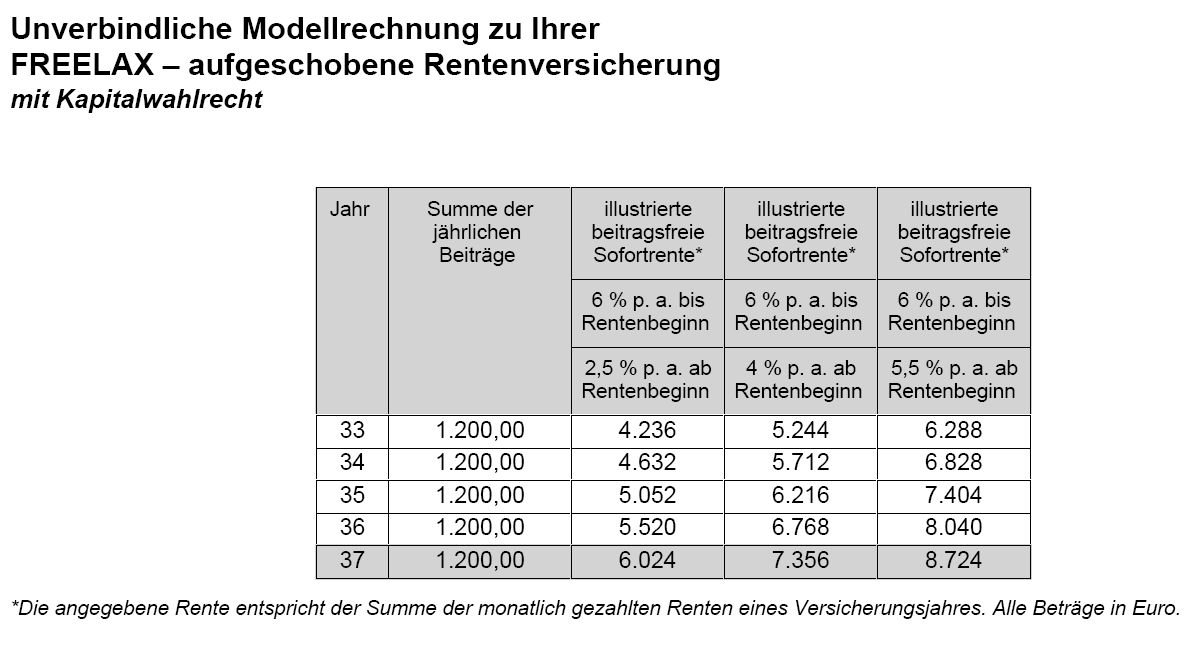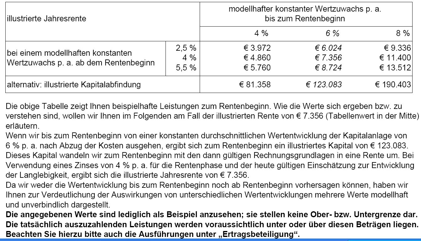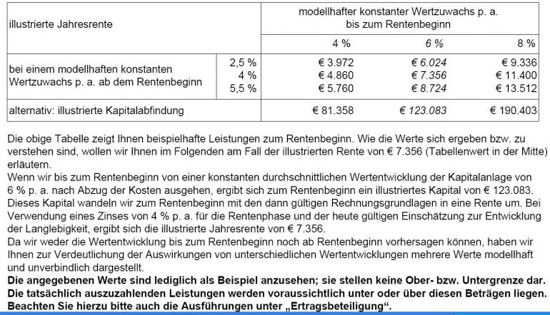 GlobalGrowth Juli 2, 2009 · bearbeitet Juli 2, 2009 von GlobalGrowth du hast ohne Kapitalverzehr gerechnet, dadurch das die Rentengarantiefaktoren so niedrig sind, wird das - ich erklär es mal schematisch - Bei Rentenbeginn wie eine Sofortrente kalkuliert, sodass die Aufzinsung + Sterbetabelle dann die entsprechende Rente bildet... Schau mal hier Ein Mann mit 67 Jahren und 50.000 Einmalanlage bekommt 282 mtl Rente Bei 4,8% 123.083/ 50.000 x 282 = 694,19 x 12 = 8330,28 Bei 3,8% 123.083/ 50.000 x 253 = 622,80 x 12 = 7473,6 Im Vergleich dazu bei der SL bei 4% = 7356 Heisst also, dass man die Kalkulationen mit Sofortrenten nach aktuellen Rechnungslegungen vergleichen kann...ausgehebelt wird das an sich durch die sehr niedrigen Rentengarantiefaktoren pro 10.000, womit sich im Ernstfall die Gesellschaft sehr viel "Luft" verschafft. Dass das eine Sofortrente ist, erkennt man an der Formulierung: "Das Kapital wandeln wir bei Rentenbeginn..." verwendet werden dann aber die Rechnungsgrundlagen in 37 Jahren. Ob die Wette aufgeht? Gruß David pps.: ich bin nicht sattelfest mit den angelsächsischen Versicherern, daher warten wir mal auf Dirk, der klärt das Prinzip auf...wobei ich mit meiner Vermutung sehr sehr nah dran sein dürfte Diesen Beitrag teilen Link zum Beitrag