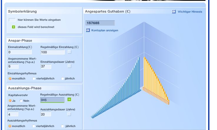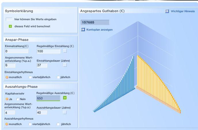 PSTVA Juli 2, 2009 · bearbeitet Juli 2, 2009 von PSTVA Das Kapital reicht für 20 Jahre, bei 946.- monatlich. SL: monatliche Rente 613.- Fondssparplan: 40 Jahre/ 650.- monatliche Rente MfG Diesen Beitrag teilen Link zum Beitrag