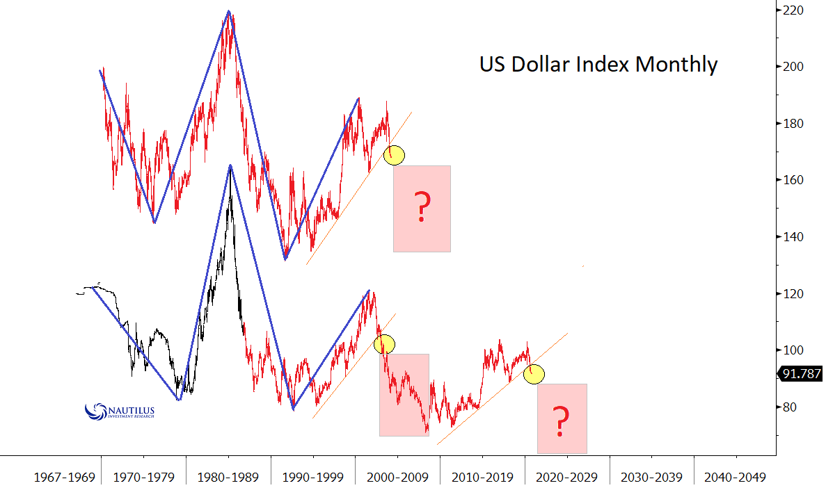 Folgt das Währungspaar dem historischen Muster, dann könnte in spätestens zehn Jahren sogar ein Tauschverhältnis von 2:1 erreicht sein. Für US-Investments würde das die Rendite über diesen Zeitraum um ca. 7% pro Jahr schmälern! Mit einer weiteren Dollarabwertung dürften aber auch wieder große Kapitalverschiebungen zwischen den verschiedenen Assetklassen stattfinden. Phasen lang anhaltender Dollarschwäche sind klassischerweise positiv für den Rohstoffmarkt und die Schwellenländer.