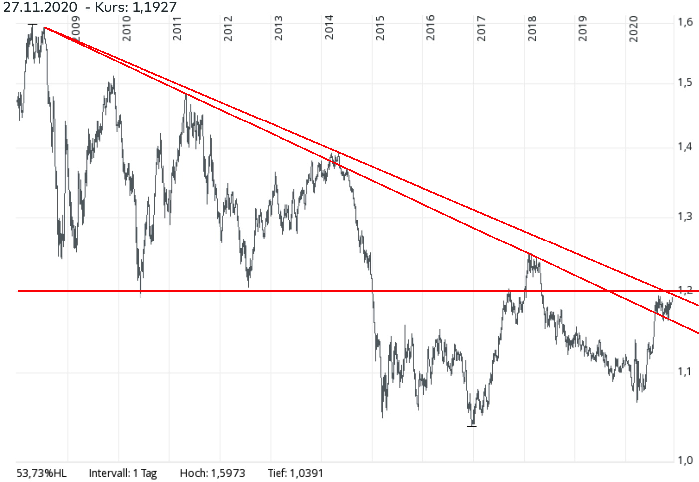 Vielleicht könnte man sich darauf einigen, dass rein charttechnisch  um 1,20 die Sache spannend wird.