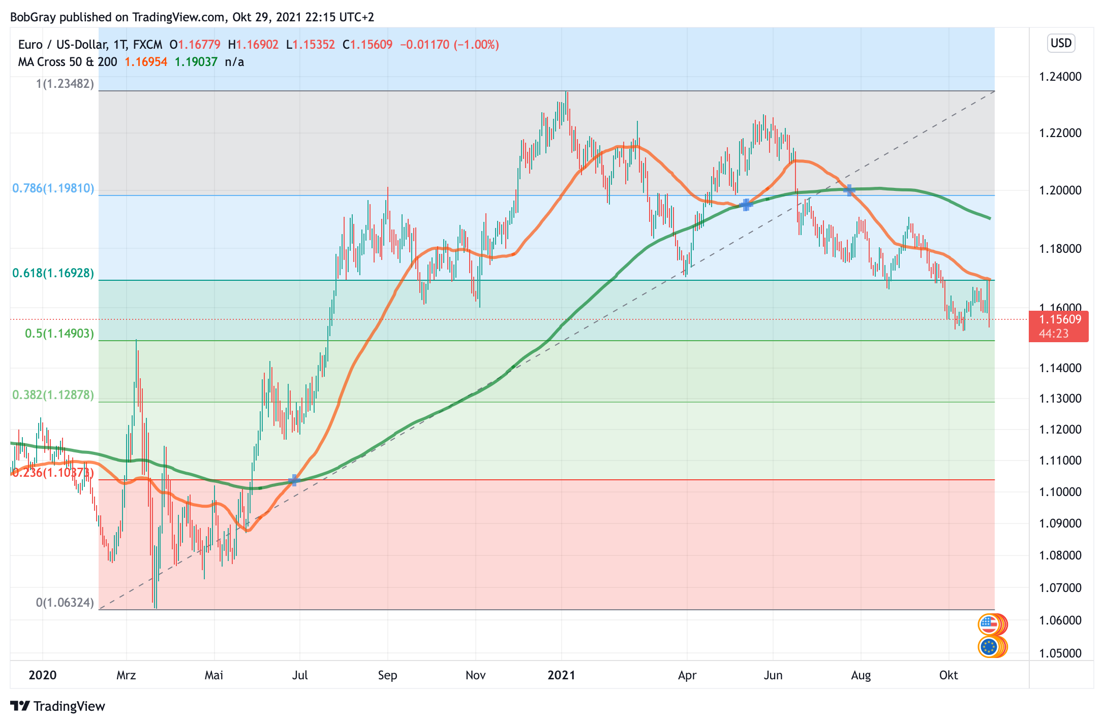 Der Wechselkurs mit seinem Tief im Corona Crash und Zwischenhoch zum Jahreswechsel 20/21 ist wieder etwas zurückgekommen. Als Laie würde ich die Charttechnik so beurteilen, dass in den letzten Monaten das 61,8er Retracement 2 Mal getestet und beim dritten Mal nach unten unterschritten wurde. Gestern kam es zu einem starken Kursanstieg genau zur 50-Tageslinie und gleichzeitigem Re-Test des 61,8ers - an dem der Kurs heute stark abgeprallt ist. Entsprechend würde ich dies so interpretieren, dass der Devisenmarkt mit höherer Wahrscheinlichkeit zu einer weiteren Aufwertung des Dollars ggü. dem Euro tendiert.