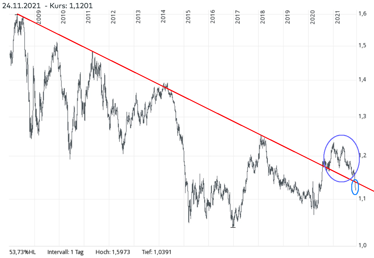 Die 1,16 ist zwar durch, so richtig nachhaltig sieht das für mich aber noch nicht aus. Auch im Gesamtbild mit den Aktienmärkten der Schwellenländer wirkt es momentan mehr wie eine sehr ausgedehnte Korrektur als ein Ende des Bullenmarktes.