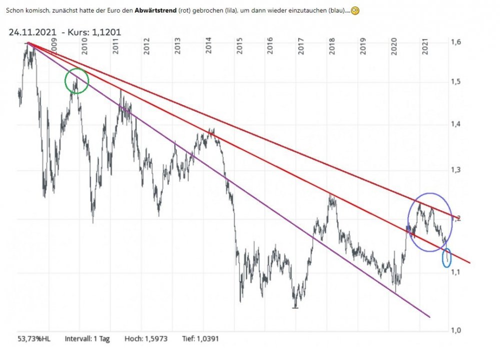 Schon komisch, zunächst hatte der Euro den Abwärtstrend (rot) gebrochen (lila), um dann wieder einzutauchen (blau)....:blink:
