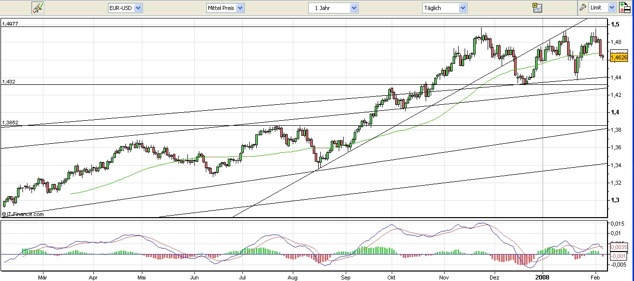 Pablo Escobar Februar 6, 2008 · bearbeitet Februar 6, 2008 von Pablo Escobar Ich bin auch seit 1,4850 Short auf €/$. Charttechnisch ist jetzt bei 1,4600 ein größerer Widerstand, obwohl ich aufgrund von Chartsignalen im MACD und auch dem Kauf von $ der Brasilianischen Zentralbank in den letzten Wochen eher zu einem Rückgang auf vorerst 1,4400 $ spekuliere... Grüße Diesen Beitrag teilen Link zum Beitrag