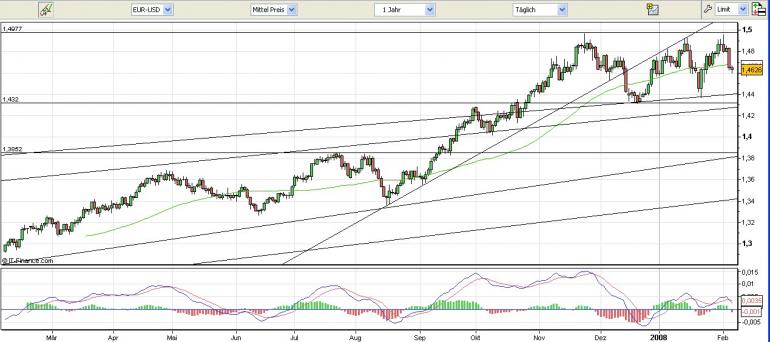 obx Januar 25, 2008 Wenn alle den Ausbruch über 1,50 vermuten, dann kommt er meist nicht.Für die meisten Dax Werte wäre ein noch schwächerer Dollar schwer zu verkraften. Naja, man weiss es nicht... Aber die Chancen für einen Anstieg auf über 1,50 stehen nicht wirklich schlecht, vielmehr spricht momentan mehr für ein weiteres Ansteigen als ein Nachgeben des Euro. Signale werden von der nächsten FED-Sitzung ausgehen, man überlege sich wie groß das Zinsgefälle bei einer weiteren Absenkung um 0,5% sein wird. Chicago (BoerseGo.de) - Die Händler an der Terminbörse in Chicago sehen im Zuge der deutlich gestiegenen Rezessionsgefahr in den USA und der jüngsten Turbulenzen an den Börsen eine Chance von 76 Prozent, dass die Federal Reserve nach ihrer außerordentlichen massiven Leitzinssenkung vom 22. Januar von 0,75 Prozentpunkten auf 3,5 Prozent im Rahmen der nächsten Sitzung des Offenmarktausschusses von 29.- 30. Januar eine weitere Herabnahme um 0,5 Prozentpunkte auf 3 Prozent vornehmen wird. Die Chance für eine Senkung um lediglich 0,25 Prozentpunkte wird mit 24 Prozent beziffert. Zu den Dax-Werten: Mittlerweile geben sich die Dax-Unternehmen schon Mühe, den drohenden Dollar-Verfall durch Währungsabsicherungen, einer Ausweitung der Produktion im $-Raum etc in den Griff zu kriegen. Jüngstes Beispiel ist BMW, die ihre Produktionskapazitäten in den USA eben aus diesem Grunde ausweiten. Oder auch Airbus (EADS ist nicht im Dax, ich weiss) verlagert nach und nach Produktionsstandorte (z.B. China) um hier dem starken Euro zu entgehen. Aber für so dramatisch halte ich den Wechselkurs noch nicht. Am 19.04.1995 lag der Euro bei $ 1,4360... Das war der absolute Höchststand der DM zum Dollar. Heute liegen wir noch ein paar Prozent tiefer... Unsere Abhängigkeit von den USA hat seitdem nachgelassen und der EU-Binnenmarkt hat weiter an Bedeutung gewonnen. Diesen Beitrag teilen Link zum Beitrag
