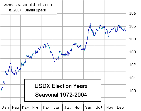 Drella August 3, 2008 · bearbeitet August 3, 2008 von Profi Hat einer ne Statistik wie sich der Dollar in den Monaten vor einer US Wahl verhält? Wäre sehr interessiert. Dank & Gruß Profi EDIT: Hab doch was gefunden: Postbank Studie zur Präsidentschaftswahl in den USA Interessant ist ein Blick auf die Kursentwicklung des US-Dollar zum Euro bzw. zur D-Mark. Der Greenback zeigt innerhalb fast aller Amtsperioden seit 1976 unabhängig von der regierenden Partei ein ähnliches Verlaufsmuster: Einem richtungslosen ersten Jahr mit leichten Kursanstiegen bzw. verlusten des US-Dollars folgen deutliche Kursrückgänge im zweiten und dritten Jahr. Und mit einer Ausnahme glänzte der Greenback in allen beobachteten Amtszeiten im Wahljahr mit einem Kursanstieg, der im Durchschnitt zehn Prozent betrug. Lediglich in der aktuellen Präsidentschaft entwickelt er sich eher flat. Hier der Seasonal Chart des US-Dollar Indexes in Wahljahren: Diesen Beitrag teilen Link zum Beitrag
