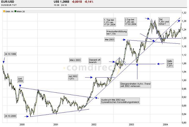 Denker Oktober 25, 2004 CrandCru ein Codi-Forum-Mitglied hätte gerne seine Beobachtung für den EUR/USD bestätigt, ob dieser jahrelange Aufstieg im wesentlichen abgefeiertt sei, oder es dann 2 - 3 Jahre in die andere Richtung gehen könnte. Ich denke mir es ist ein sehr interessantes Thema, welches ich hier zu Diskussion stellen möchte. Ausgehend von dem oben abgebildeten EUR/USD Chart, den ich mit dem Codi-Chartanalyzer erstellt habe, sehen wir einen 5 jährigen Betrachtungszeitraum. Meine Betrachtung / Analyse Beginn der Chartbetrachtung ist der 24.10.1999. Am 24.10.2000 markiert der Kurs ein Allzeittief in diesem Betrachtungszeitraum. Gleichzeitig formte sich im Juni 2000 ein Symmetrisches-Konsolidierungsdreieck mit einer hohen Volatilität. Diese Phase der Bodenbildung hielt bis Anfang Mai 2002 an. Schließlich gelang es im Mai 2002 aus dem S.-Konsolidierungsdreieck, bullish auszubrechen. Dieser Aufwärtstrend hielt bis Juli 2002 bei 1,01xx an. Es kam zu einer gesunden Konsolidierung mit anschließendem Doppeltop und überwinden der 1,01xx Marke. Dieses katapultierte den Kurs im März 2003 bis zur Haltezone von 1,07xx. Dabei bildete sich ein Diamant, welches charttechnisch oft als bearish gesehen werden muss. Der langfristige Aufwärtstrend wurde durch eine Diamant- Formation nicht berührt oder verlassen, so konnte der Kurs seinen weiteren Aufwärtstrend fortsetzen, bis im Mai 2003. Dort bildete er abermals ein Doppeltop. Diese Formation leitet in der Regel eine Konsolidierung ein. Diese aber war so heftig, dass sie den übergeordneten Aufwärtstrend seit 2002 verließ, welches als sehr negativ zu bewerten war. Bei "über" der Haltelinie von 1,07xx stoppte der Kurs und somit gelang es dem Kurs, wieder in den alten übergeordneten Aufwärtstrend zu gehen. Diesen Beitrag teilen Link zum Beitrag