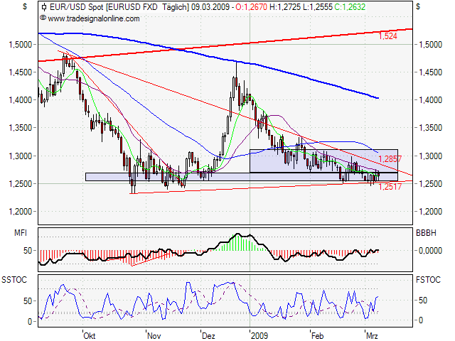 balu09 März 9, 2009 Der Euro/Dollar zeigt im allgemeinen schöne, gut handelbare Trends, wenn diese denn losgetreten werden. Im Chart zeigt sich aktuell eine interessante Konstellation. Im intakten Abwärtstrend (primär, sek. und tert.) läuft der Preis in eine Dreiecksituation hinein und befindet sich hier zur Zeit in einer Trading Range. Die untere Spanne dieser Range fungierte Mitte Februar als Widerstand in der vorhergehenden Abwärtsbewegung. Ende Februar wurde der Versuch unternommen, sich durch einen Pullback wieder von diesem Widerstandzu entfernen. Die Gegenbewegung endete jedoch sofort am GD20. In der Folge "sprang" der Preis ohne Gegenwehr wieder in Richtung 1,25 nach unten. Der E/D schafft es nun seit Anfang März nicht mehr, die untere Volume Zone (unteres Rechteck) zu verlassen. Jeder Übertritt endete genau am GD20. Ich mag diese Konstellation sehr gerne, da in einer eindeutigen Trendsituation eine Konsolidierung am unteren Ende einer Dreiecksformation auftritt. Der Euro versucht sich zu halten, aber es könnte sein, dass ein sich erneut verstärkender Verkaufsdruck zum Bruch der 1,25 führt (Pullbacks endeten konsequent am GD20, was ich übergeordnet als Zeichen einer Käuferschwäche sehe). Langer Rede kurzer Sinn, wenn die 1,25 fallen, bin ich short. Aufgrund der baerishen Trendsituation würde ich eine Ausbruch nach oben nicht handeln. Diesen Beitrag teilen Link zum Beitrag