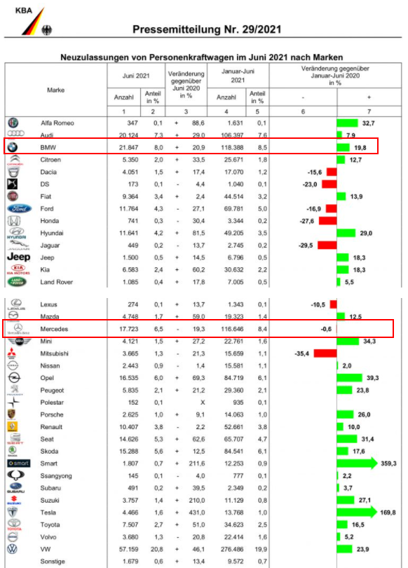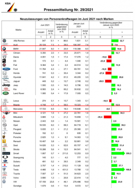Hauerli Juli 6, 2021 · bearbeitet Juli 6, 2021 von Hauerli Zitat ... Im ersten Halbjahr 2021 summieren sich die Neuzulassungen von BMW auf 118.388 Einheiten, Mercedes liegt mit 116.646 Neuzulassungen auf dem zweiten Rang. Audi rangiert mit 106.397 Fahrzeugen auf dem dritten Rang des Premium-Trios. Betrachtet man auch die Submarken MINI und Smart, wächst der Vorsprung der BMW Group um gut 12.500 Einheiten... Quelle: https://www.bimmertoday.de/2021/07/06/juni-1-halbjahr-2021-bmw-deutschland-uberholt-mercedes/ Nachdem man letztes Jahr mit der M GmbH die AMG Sparte von Mercedes in den Verkaufszahlen erstmals überholt hat, geht die aufholjagt bei der Hauptsparte weiter. Es zeichnet sich ab, dass es eine Wachablösung an der Spitze der deutschen Premiumhersteller geben könnte. Diesen Beitrag teilen Link zum Beitrag