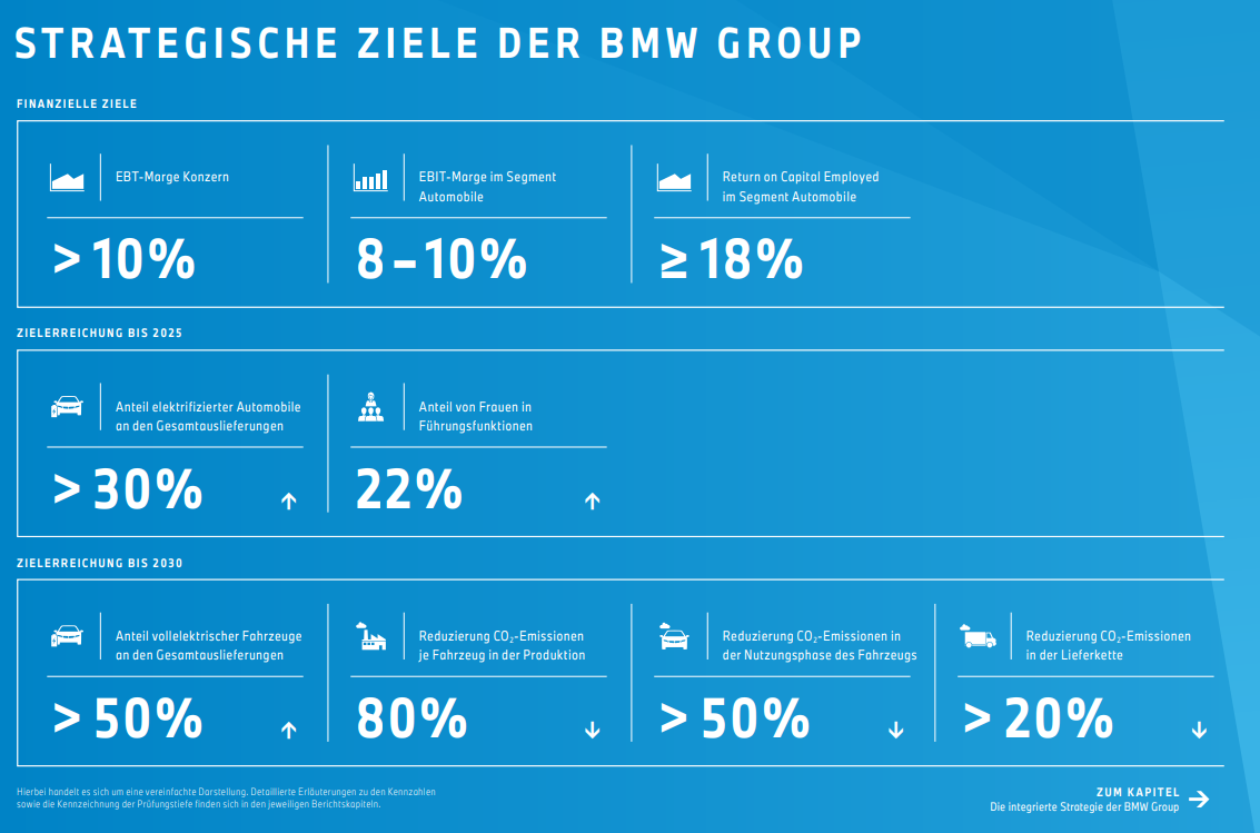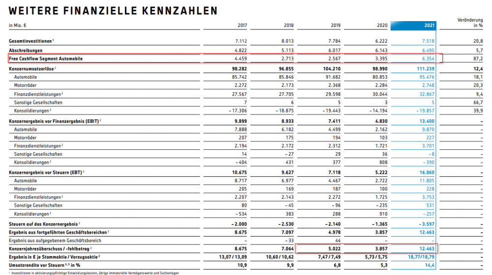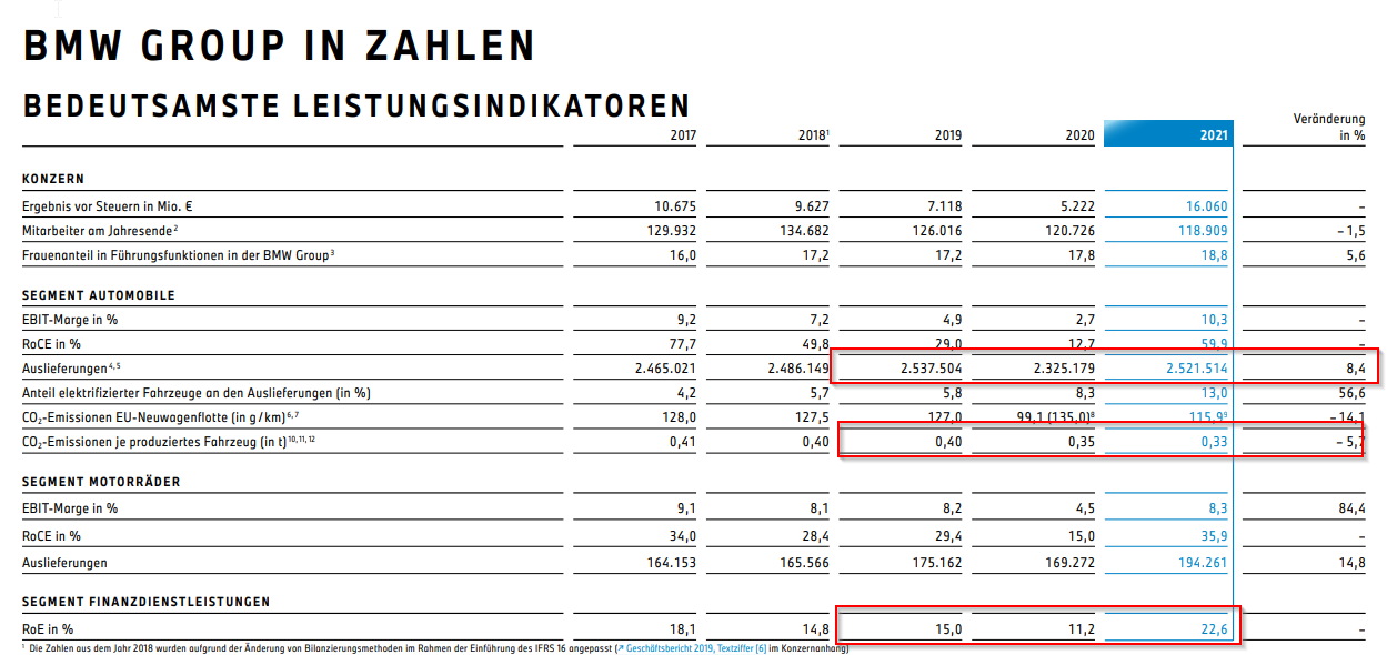Hauerli März 18, 2022 · bearbeitet März 18, 2022 von Hauerli Schaut gut aus Nicht nur die Zahlen stimmen sondern auch die Entwicklung zur CO2 Reduktion im Fahrzeug sowie in der Produktion. Das Unternehmen hat ein klares Ziel vor Augen und lässt sich in ihrem Prozess nicht verunsichern. 2022 wird spannend, durch den Ukraine Krieg geht man derzeit von einem EBIT Korridor zwischen 7-9% aus. Einführung von iX1 und i7 ist ebenfalls in 2022. Quelle: https://www.bmwgroup.com/content/dam/grpw/websites/bmwgroup_com/ir/downloads/de/2022/bericht/BMW-Group-Bericht-2021-de.pdf Diesen Beitrag teilen Link zum Beitrag
