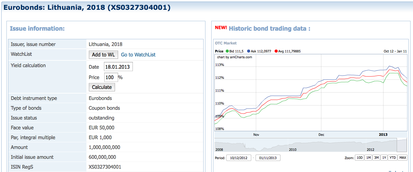 vanity Januar 17, 2013 ISIN XS0410083934 (steht im Untertitel) 9,95% Litauen bis 09.12.2015 Die Anleihe wurde bis Ende Feb. '12 in FRA gehandelt und dann ausgeflaggt (k. A., warum). Handelsplatz in DE gibt es keinen. Die Kurs/Rendite-Angabe in LUX ist m. E. unrealistisch (Kurs 114, Rendite 4,x%), Litauen EO bis 2016 (LITA) liegt bei glaubhaften 1,6%. Diesen Beitrag teilen Link zum Beitrag