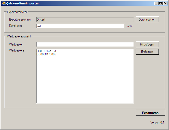 Lobster Januar 15, 2011 Ich habe ein kleines Programm geschrieben mit dem man auch die csv-Dateien erstellen kann.. Ist aber noch sehr rudimentär. Ziel ist es die Daten automatisch bei Quciken einzulesen. Im Idealfall sollte es also wirklich nur ein Buttonklick sein (oder nichtmal das über einen zeitgesteuerten Job). Wenn ihr nögt, lönnt ihr es euch ja mal ansehen. Feedback istnatürlich erwünscht. Aktuell funktioniert der Kurs-Importer leider nicht mehr wie gewünscht. Ich plane aber eine neue Version, kann euch nur leider nicht versprechen, wann ich diese veröffentluichen werde. Diesen Beitrag teilen Link zum Beitrag