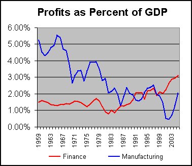 losemoremoney November 6, 2010 · bearbeitet November 6, 2010 von losemoremoney Bitte vergiß nicht, dass die Industriequote der USA nur noch 20% beträgt. 80% sind Dienstleistungen und Landwirtschaft. Diese 20% des BIP werden durch die geldpolitischen Maßnahmen der FED locker absorbiert (die hat jetzt 26% des US-Haushaltsdefizits in den Büchern und jenes ist > 100% BIP) Ich hab vor einiger Zeit mal ne interessante Statistik gesehen; das aufgrund des übermächtigen Finanzsektors das meiste was an Wirtschaftsleistung erbracht wird auf der Grundlage von Papierprofite basiert und nicht auf realen produktiven Output, das erklärt auch weshalb die Unternehmensgewinne steigen wenns der Börse gut geht und fallen wenns schlecht läuft. Hier mal aus Wiki. Financialization is a term sometimes used in discussions of financial capitalism which developed over several decades leading up to the 2007-2010 financial crisis, and in which financial leverage tended to override capital (equity) and financial markets tended to dominate over the traditional industrial economy. ,haha deshalb brauchen wir steigene Börsen und QE2. http://en.wikipedia.org/wiki/Financialization Dr. Marc Faber hat dazu mal ne Statistik gebracht mal schauen ob ich sie finde. Hier auf der Seite mal das Dollartradingvolumen im Verhältnis zum GDP. http://www.cross-currents.net/charts.htm Sieht so aus,als ob Wallstreet nur mit Traden und Derivaten Kohle macht und Mainstreet arbeitslos und unproduktiv zu Hause vor sich hinoxidiert, kann das auf Dauer gesund sein? Diesen Beitrag teilen Link zum Beitrag