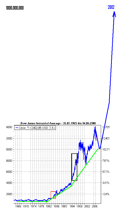 WarrenBuffet1930 November 8, 2010 · bearbeitet November 8, 2010 von WarrenBuffet1930 Bis zu meinem Ableben wird der Dow Jones vermutlich noch die 100.000 Punkte erreichen. Das ist alles andere als abwegig. Der Dow hat seit seinem Bestehen bereits mehrfach nach zähen Phasen ohne Gewinn 1.000% zugelegt. Sowas sprengt die Vorstellungskraft der meisten, ein Blick auf den Langfristchart zeigt, dass es lediglich eine Fortschreibung der historischen Entwicklung wäre. Diesen Beitrag teilen Link zum Beitrag