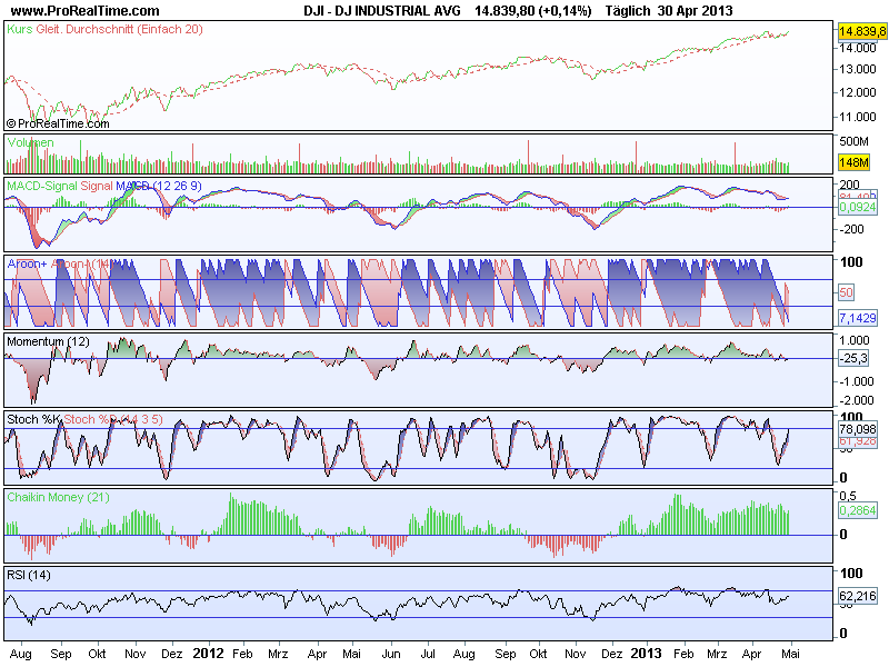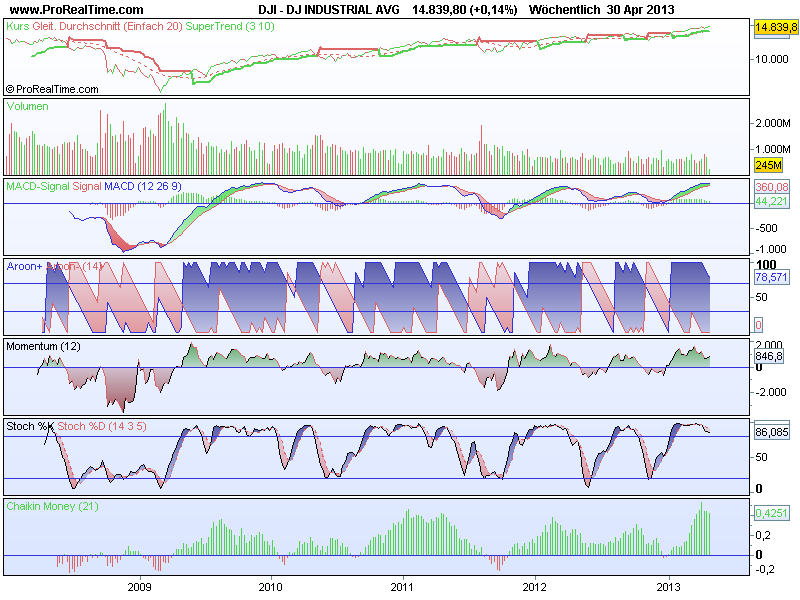 Sthenelos Mai 1, 2013 Aktueller Chart (bzw. von gestern) und Indikatoren: 1. Linienchart 2. Daily 3. Weekly Interpretation Der Dow konnte das ATH Mitte April nicht übertreffen, daher besteht immer die Möglichkeit einer kleinen Verschnaufpause. Der Daily sieht eigentlich gut aus, der MACD könnte nach unten fertig haben, hat auf hohen Niveau korrigiert. Weekly sieht man aber, wie sowohl MACD und Stocha schöne Hügel erreicht haben und dass die Möglichkeit einer längeren Korrektur besteht (aber nach wie vor: auf extrem hohem Niveau, was in einem derart bullishen Markt auch sogar steigende Kurse, oder gleichbleibende bedeuten kann). Der Dow kann in den nächsten Tag im "schlimmsten Fall" auf ca. 14300-400 korrigieren (ich glaubs aber nicht). Insgesamt sehe ich aber noch keine Trendwende, die Korrektur im Weekly ist wahrscheinlich, könnte ein paar Monate dauern, wann sie eintrifft sieht man noch nicht, vielleicht ist jetzt schon der Beginn, vielleicht erst in ein paar Wochen. Es bleibt insgesamt noch bullish, keine Panik, keine großen Verkaufssignal (Interpretationssache mit weekly, für mich aber noch keine großen Verkaufssignale). Long auf den Dow würde ich jetzt aber auch nicht mehr gehen wollen... Diesen Beitrag teilen Link zum Beitrag