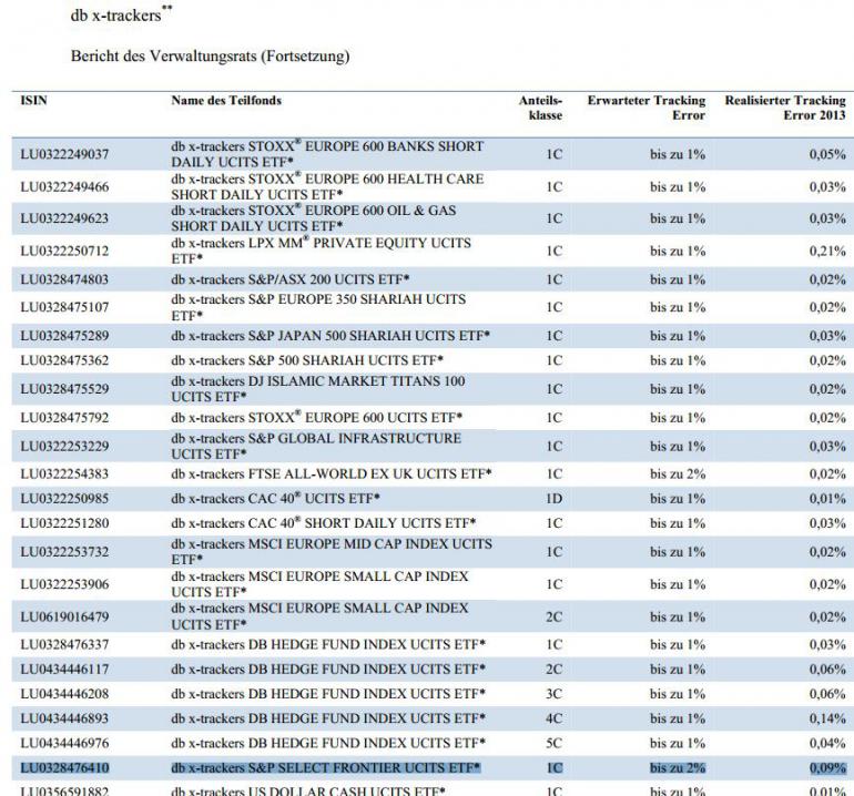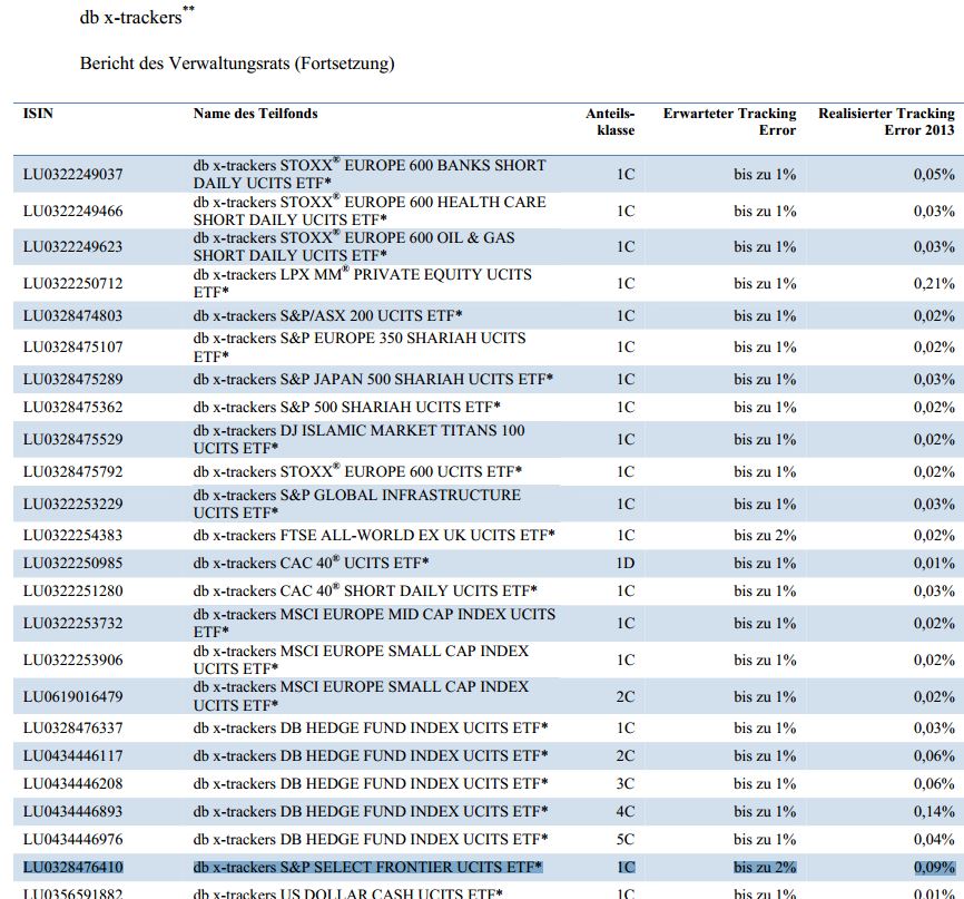 Im Jahresbericht 2013 von DBX-Tracker (Seite 18) steht beim entsprechenden Fonds, dass der realisierte Tracking Error lediglich 0,09% beträgt. Beim erwarteten Tracking Error wird wiederum die Angabe "bis zu 2%" gemacht. Unter Berücksichtigung der voraussichtlichen Abbildungsdifferenz hat mich das doch ein wenig irritiert. Bisher noch positiv, oder was habe ich nicht verstanden? Kommt da jetzt noch etwas drauf??