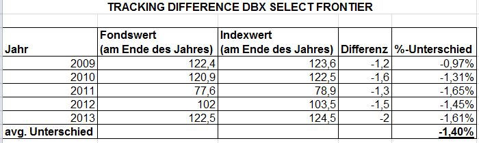 Bei der Berechnung der durchschnittlichen "Tracking DIFFERENCE" komme ich jetzt für den Zeitraum von 2009-2013 auf -1,4%. Das stimmt besser mit den Daten der Webseite überein!