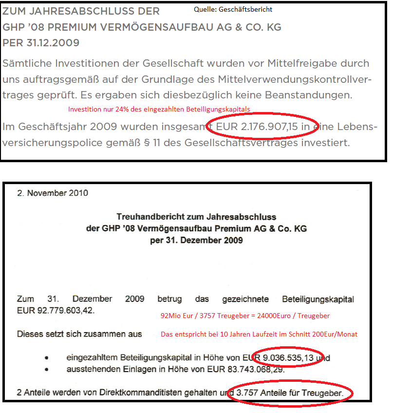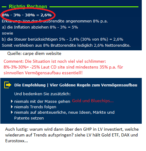 Schinzilord Dezember 19, 2010 · bearbeitet Dezember 19, 2010 von Schinzilord Punkt 1: Ich hab heute mal ein bisserl auf der CD Website geschaut und ein paar interessante Sachen gefunden: Ich glaube das steht für sich selbst.. Soviel zur Finanzmathematischen Genauigkeit und dem Beherrschen der Grundrechenarten bei CD. Punkt 2: Investition des GHP (indirekt über LV): Quelle: Geschäftsbericht CIS_GHP08_FB2010_WEB.pdf Hier ein Auszug aus ebendiesem Geschäftsbericht: Lustigerweise ein Statement aus der Zeitschrift "Der freie Berater" Ausgabe 04/10: Zusammenfassend lässt sich sagen: Der Freie Berater empfiehlt den Garantiehebelplan 08 (Große Werbung auf der Titelinnenseite). Der Freie Berater und Daniel Shahin sind gegen Goldinvestments. Der Freie Berater und die carpe diem Seite sehen Lebensversicherungen als ungeeignetes Investment für den Vermögensaufbau Demgegenüber stehen: Der GHP08 investiert in Lebensversicherungen. Der GHP08 investiert massiv in Gold und Silber ETFs. (siehe Auszug aus Geschäftsbericht). Schlussfolgerung: So genau nehmenCarpeDiem und der Herr Sahin ihre eigenen Empfehlungen nicht. Punkt 3: Absenkung der Garantie der ZIelinvestments. Laut dem Geschäftsbericht geht hervor, dass die Mitgesellschafter zustimmen sollen / bereits zugestimmt haben, dass die Garantieversprechungen der Zielinvestments abgesenkt werden soll: Also ist auch das Argument der garantierten Zielinvestments nicht mehr gültig. Dementsprechend schlagen negative Entwicklung noch deutlicher für den Mitgesellschafter durch. Punkt 4: Beteilgungskapital: Nur 24% der eingezahlten Summe wurden in 2009 investiert. Je Treugeber entfallen im Schnitt 24000 Zeichnungssumme. Diesen Beitrag teilen Link zum Beitrag