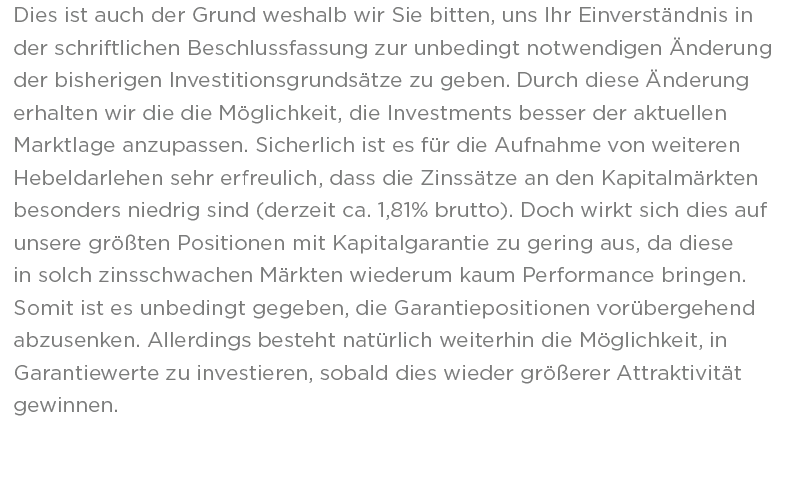 Delphin Dezember 19, 2010 · bearbeitet Dezember 19, 2010 von Delphin Schinzilord, da hast du dir aber viel Mühe gemacht! Ein paar Kommentare von mir: Zur Prozentrechnung auf der Internetseite, das finde ich gar nicht mal so extrem, denn immerhin ist dann die im detail erklärte Rechunug richtig, soweit ich das sehe. Abgesehen davon gibt es sogar Taschenrechner, wo man 100 - 6% eintippen kann und es kommt nicht 99,94 raus, sondern 94. Also bei Prozentrechnung darf man nicht zuviel mathematische Korrektheit erwarten. [quoteZusammenfassend lässt sich sagen: Der Freie Berater empfiehlt den Garantiehebelplan 08 (Große Werbung auf der Titelinnenseite). Der Freie Berater und Daniel Shahin sind gegen Goldinvestments. Der Freie Berater und die carpe diem Seite sehen Lebensversicherungen als ungeeignetes Investment für den Vermögensaufbau Demgegenüber stehen: Der GHP08 investiert in Lebensversicherungen. Der GHP08 investiert massiv in Gold und Silber ETFs. (siehe Auszug aus Geschäftsbericht).Ich glaube, du liest die Prozentangaben in der Liste falsch, das ist doch nicht die Aufteilung, sondern die bisherige Performance der Investments, oder nicht? Der Fonds steckt doch zu 80% in den beiden Kapitalgesicherten Anlagen, das andere ist nur Beimischung. Auch das Gold und die erwähnten Silberminenaktien. Absenkung der Garantie der ZIelinvestments. Laut dem Geschäftsbericht geht hervor, dass die Mitgesellschafter zustimmen sollen / bereits zugestimmt haben, dass die Garantieversprechungen der Zielinvestments abgesenkt werden soll:Also ist auch das Argument der garantierten Zielinvestments nicht mehr gültig. Dementsprechend schlagen negative Entwicklung noch deutlicher für den Mitgesellschafter durch. Das finde ich viel spannender. Man kann also zusammenfassend sagen, dass es bisher nicht geklappt hat mit Garantie-Fonds deutlich über dem Fremdkapitalzins zu liegen und gleichzeitig die erheblichen Kosten zu decken. Schuld ist natürlich die Marktsituation, die so garnz anders ist, als das "geplant" war. Ich frage mich, was eigentlich wäre, wenn ganz lapidar die Zinsen steigen würden? Na ja, angeblich sei dann ja auch von diesen Multi-Asset-Garantie-Fonds mehr zu erwarten. - Die Logik kann ich so nicht ganz nachvollziehen. Heinzingers Plan ist nun offenbar, die ursprüngliche Investmentidee zu ändern und sich mehr exotische Asset-Klassen zu erlauben. Aus dem Gesellschafterbeschluss: Die Erweiterung der Investitionsmöglichkeiten ist Voraussetzung für ein breiteres Investment seitens derGeschäftsführung. Das Ziel einer zweistelligen Rendite ist über verschiedene Wege erreichbar. Realistischer ist es jedoch unter Ausnutzung aller Investitionsmöglichkeiten, die ein solches Ergebnis in Aussicht stellen. Alle angedachten Zielinvestitionen ermöglichen nach Kenntnis und Begutachtung dieser ein solches Ergebnis. Und das sind die neuen Anlage-Klassen: 1. InvestitionenDie Gesellschaft kann alle nachfolgend genannten Vorhaben nicht nur direkt, d.h. eigenständig, im eigenen Namen (nachfolgend „Direktinvestition"), sondern auch indirekt über einen Dritten z. B. im Wege einer stillen Beteiligung, eines partiarischen Darlehens oder eines Nachrangdarlehens gegen eine feste und / oder variable Gewinnbeteiligung durchführen, sofern die entsprechende vertragliche Vereinbarung eine Verlustteilnahme der Gesellschaft nicht ausschließt oder einen qualifizierten Rangrücktritt der Gesellschaft beinhaltet (nachfolgend „Finanzierungsmodell"). [...] 1.2 Jede Art von Immobilien, [...] 1.3 Prozesskostenfinanzierungen, [...] 1.4 Projektinvestitionen, [...] 1.5 Jede Art von Kapitalanlagen / Investmentfonds, [...] 1.6 Darlehen, die die Gesellschaft ihren Anlegern auf Antrag in besonderen Einzelfällen in Höhe der Summe der Kapitalkonten I und II, abzüglich eines Verlustes in Kapitalkonto III, maximal jedoch in Höhe des Abfindungsbetrages im Fall einer Kündigung zu einem Zinssatz gewährt, der dem Dispositionskreditzinssatz der Hausbank der Gesellschaft entspricht. [...] 1.7 Jede Art von Unternehmensbeteiligungen Damit ändert sich das Konzept des GHP ziemlich, würde ich sagen. Alternative Investments sind jedenfalls offenbar der Plan, um außergwöhnliche Renditen aufzutreiben. Garantie muss da wohl etwas zurückstehen, aber ich fand die Idee Garantiefonds zu hebeln ohnehin ein bisschen windig. (Wäre aber mal interessant, wenn mir jemand erklären könnte, wie sowas die Verteilung der erwarteten Rendite ändert.) Es sind auch viele rechtliche Änderungen dabei, hab ich nicht alles durchgelesen, aber klingt, als wenn mehr Mitbestimmung möglich ist. (Und künftig erneute Umstrukturierungen einfacher werden.) Diesen Beitrag teilen Link zum Beitrag