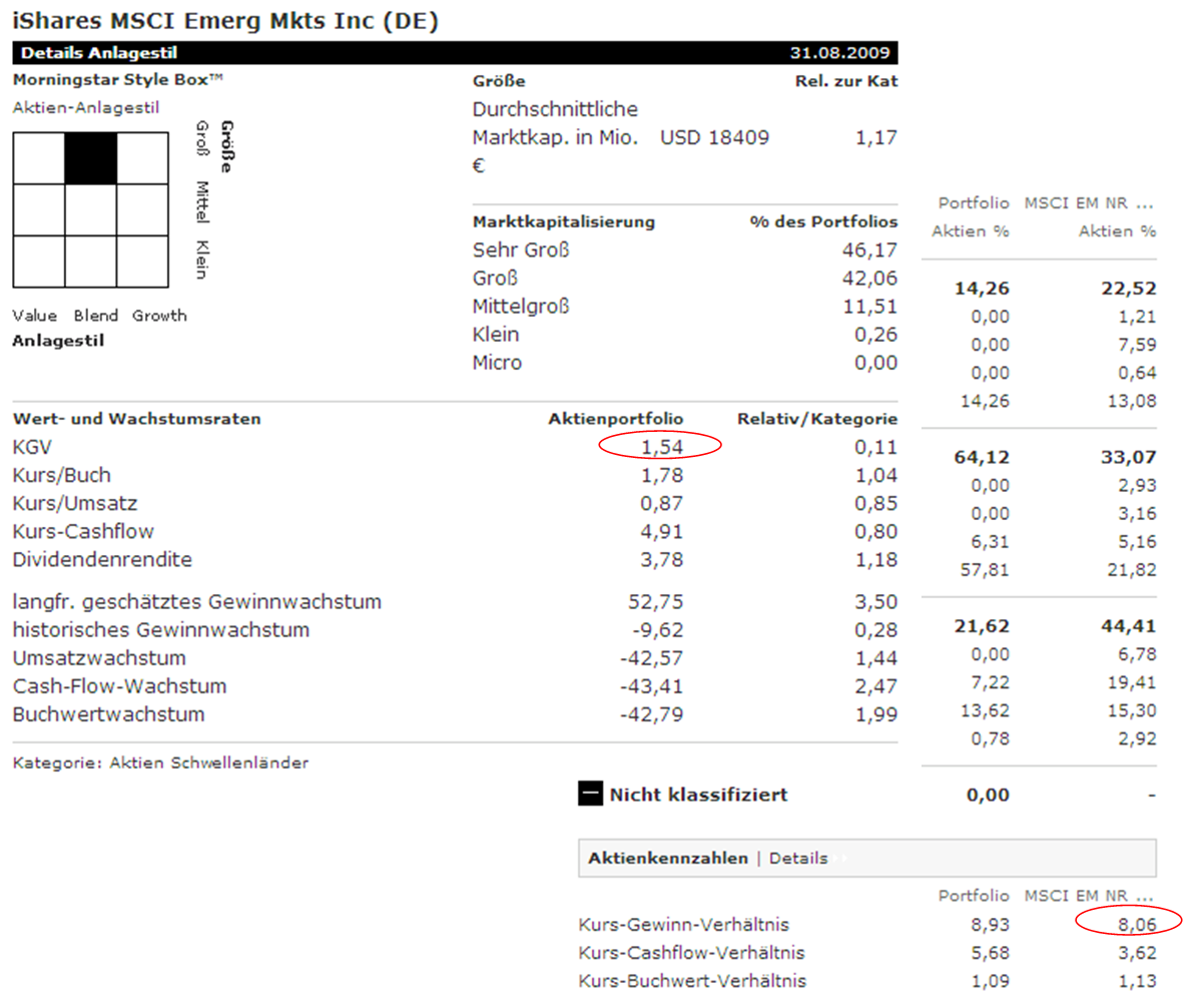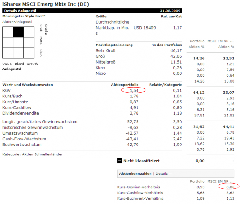 Beispiel ist die augenblickliche Bewertung der iShare Emerging Market ETF (Durchschnittlicher KGV bei 1,54), die nur falsch sein kann und im direkten Widerspruch zum MSCI EM KGV von 8,06 steht.
