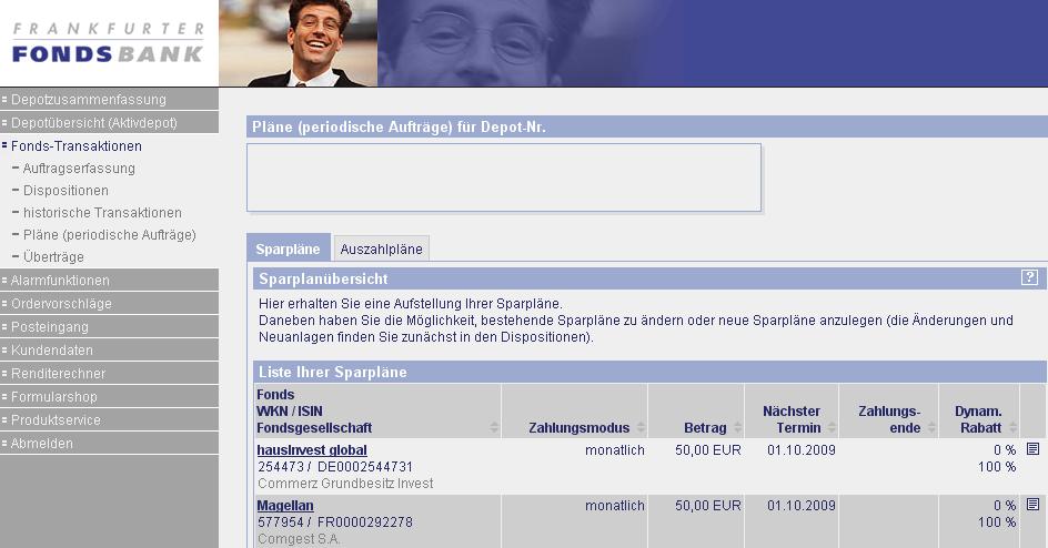 ghost_69 September 28, 2009 Hallo Martin Ich denke mal das Deine beiden Depots noch nicht als Passiv und Aktiv unterteilt sind oder ? ... hier ein Auzug aus meinen Sparplänen ... ... einfach ganz am Ende wo die Details stehen klicken vorne Fondsname dann monatlich dann Betrag dann nächster Termin und Zahlunsende, danach Dynamisch und der Rabatt und dann am Ende das Kästchen anklicken ... ... dort auf beenden oder eben ändern gehen, in Deinem Fall auf beenden. ... und genau so richtest Du auch die neuen Sparpläne ein, startest wieder auf der Seite oben, ganz unten steht dann einrichten. Für Deine Frau schlage ich diese vor: Carmignac Patrimoine A - A0DPW0 Carmignac Investissement A - A0DP5W Magellan - 577954 Für Dich auch erstmal das gleiche: Carmignac Patrimoine A - A0DPW0 Carmignac Investissement A - A0DP5W Magellan - 577954 später würde ich da etwas anderes wählen ! Ich würde erstmal so anfangen ! Ghost_69 :- Diesen Beitrag teilen Link zum Beitrag