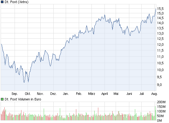 markymark Juli 13, 2012 Sehr fein! Die Deutsche Post zeigt eindrucksvoll, wohin sie will. Knabbert schon am Jahreshoch und gehört auf Jahressicht zu den Topperformern im Dax. Trotz Konjunkturdelle zeigt sich bisher überhaupt keine Schwäche. Starke Marktstellung trotz Konkurrenz. Gute Dividendenrendite und Cashflow. Diesen Beitrag teilen Link zum Beitrag
