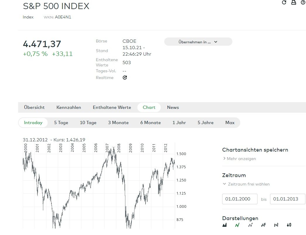 DAX43 Oktober 17, 2021 vor 21 Minuten von masu: Liegt hier bei mir ein Denkfehler vor, wie seht ihr die Sachlage in einem 15-20 Jahres Horizont. kommt immer darauf an, welchen 15-20 Jahre Zeitraum du nimmst. Schaue dir mal die S&P500 Kurse zwischen 2000 - 2012 an. Wie hättest du dich in diesen 12 Jahren mit einem S&P500 ETF gefühlt. Und hättest du dann auch die Geduld gehabt, und weiter an die Worte von Buffett geglaubt ? Langfristig würde ich auch nie gegen die Amis wetten, aber zwischendurch gibt es auch mal schwere Zeiten. Gedanken mache ich mir zum Beispiel über die Politik in den USA. Das ist im Grunde schon ein Krieg zwischen den Demokraten, und den Republikanern. Dieses Pulverfass könnte uns eines Tages um die Ohren fliegen. Donald Trump, oder noch schlimmer , Trump Junior als Präsident gewählt, und es könnte noch einen Schritt weiter gehen, als der Sturm auf das Kapitol. Diesen Beitrag teilen Link zum Beitrag