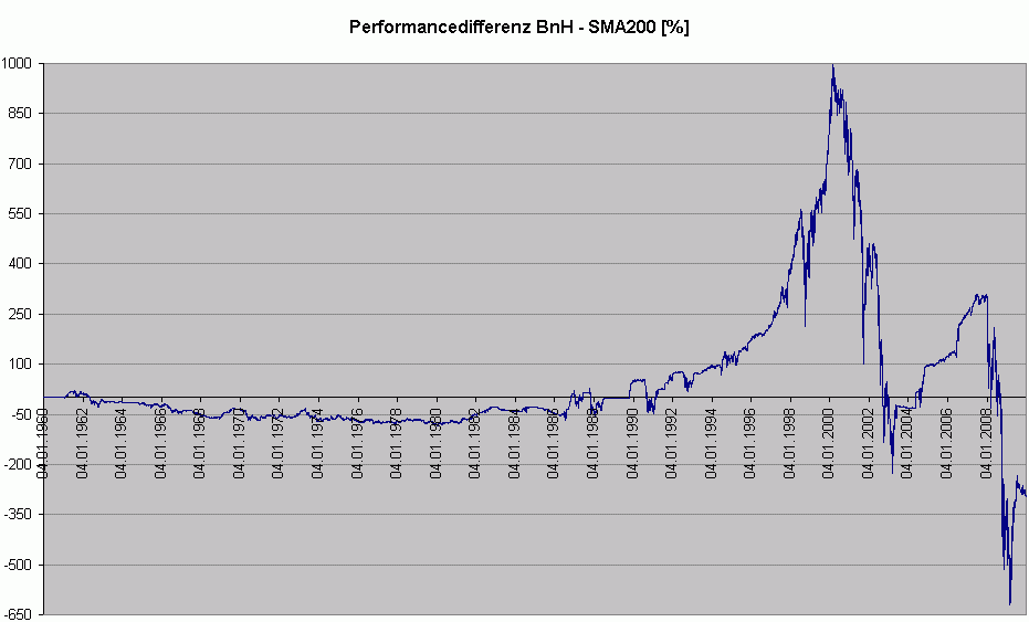 Mit anderen Worten: Ein Einmalinvestment am 04.01.1960 hätte mit der SMA200-Strategie tatsächlich eine um ca. 294% bessere Rendite ergeben als mit BnH.