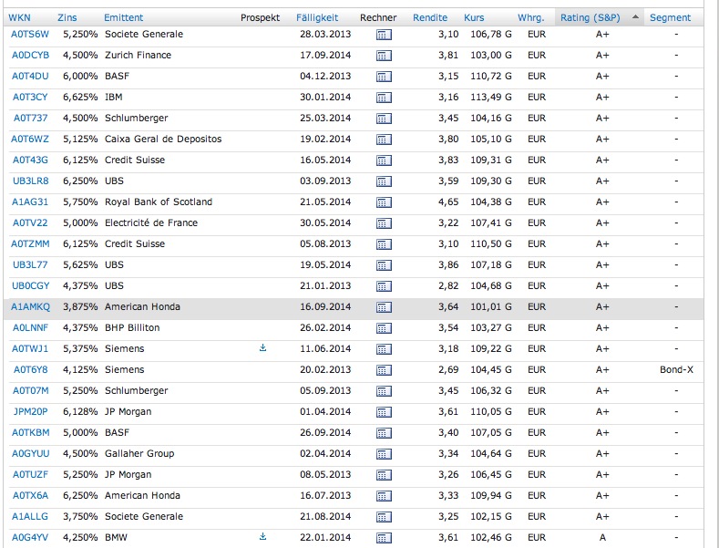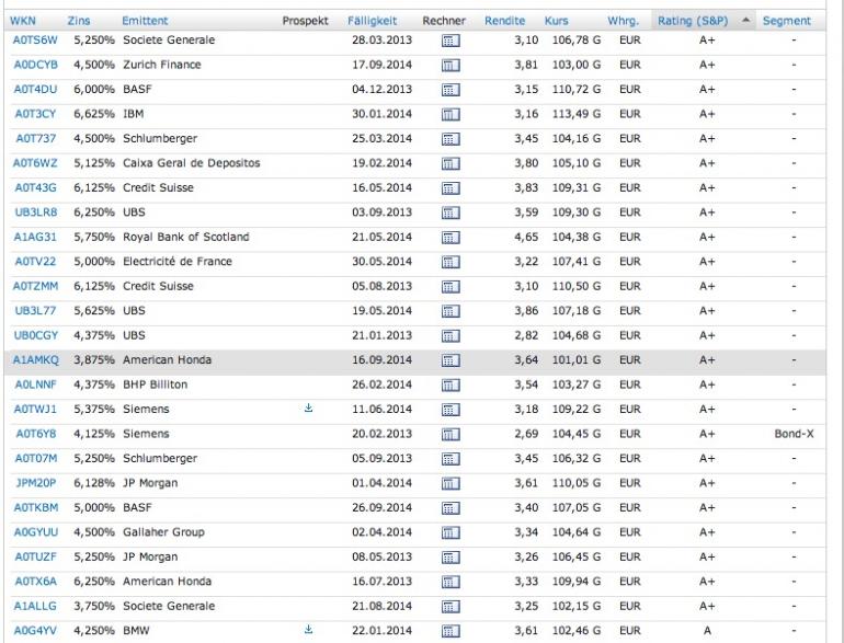 BondWurzel November 7, 2009 · bearbeitet November 7, 2009 von BondWurzel danke dir für das Bsp. zu bequem bin ich sicherlich nicht... allerdings hab ich schon etwas Respekt vor dem für mich neuen Anlagegebiet... auf den Infoseiten von Börse-Stuttgart.de etc. hagelt es ja erstmal jede Menge Zahlen :- was kann ich tun, um mich auf eine Anleihe "vorzubereiten"? - grobe Vorauswahl aufgrund des Ratings (zunächst mal keine "Risikoanleihen" - Studieren des Emittentenprospektes - Recherche über den Firmenzustand (Zahlen, zukünftiger Geschäftsausblick etc.) macht es Sinn, Unternehmensanleihen über Branchen zu streuen? Stichwort: Transportwesen, Gesundheit, Autobauer etc. Vorbereiten kann man sich schon über's Rating und dann die Branche. Hängt imho von der Höhe der Anlagesumme ab...logisch. Manche Bonds gibt es nur in 50.000er-Stückelungen oder man kauft über CLNs ein = 1000er-Stückelung, ansonsten entscheidet deine Risikobereitschaft. Wenn ich "gute " Bonds habe, dann streue ich nicht viel. Hier kann man auch gut wühlen...;-) http://www.boerse-frankfurt.de/DE/index.aspx?pageID=107 Diesen Beitrag teilen Link zum Beitrag