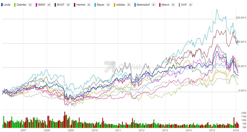 Ca$hflow Februar 24, 2016 Speziell im Dax gibt es nur wenig interessante Titel, da dieser vollgestopft ist mit Zyklikern (u.a. Automobilhersteller, Versicherungen, Banken). Beispielhaft mal 3 Unternehmen welche als sehr robust eingestuft werden können. Unternehmen (Max. Gewinnrückgang der letzten 10 Jahre) SAP (-13%) Henkel (-13%) Linde (-16%) Das Problem an der Auflistung ist doch allerdings folgendes, obwohl das der max. ausgewiesene Gewinnrückgang innerhalb von 10 Jahren war (gehe jetzt einfach mal davon aus, dass das richtig ist), haben alle Titel in der Abwärtsphase innerhalb des Zeitraums deutlich mehr an Wert an der Börse verloren (während der Baisse). Infolgedessen sind dann die KGV´s gefallen, was aus deiner Sicht die Unternehmen attraktiv macht. Allerdings konnte beginnend von der Baisse und der anschließenden Hausse nur eines der drei Unternehmen wirklich gegenüber den Zyklikern richtig punkten und zwar Henkel. Die anderen beiden schwimmen irgendwo im Mittelfeld mit oder sogar unterdurchschnittlich. Ausgehend von der Rendite (der Chance) wiesen die anderen beiden Unternehmen keine wirklichen Überrenditen gegenüber z.B. den alternativen Zyklikern auf. Auch beim Risiko (Volatilität) konnten die Unternehmen kaum punkten. Natürlich kommt es am Ende immer beim Vergleich auf die Details an, wenn man jetzt Bankenwerte als Maßstab nehmen würde, dann würden sowohl deine drei „robusteren“ Dax-Unternehmen wie auch die anderen non-financial Zykliker Überrenditen aufweisen. Der Punkt ist allerdings der, nur eins deiner drei Unternehmen konnte in dem Zeitraum gegenüber den meisten anderen Titeln/Zyklikern wirklich abnormale (also langfristig bessere) Renditen erzielen, während die anderen beiden es nicht kommt und damit die These: Relevant dafür sind zwei Phasen: Zykliker im Krisenmodus, d. h. auf Basis ihres KBV nahe ihres historischen Tiefs und alle übrigen Zeiten. Es reicht doch aus, wenn: robuste Aktien zyklusübergreifend keine schlechtere Performance als Zykliker aufweisen und robuste Aktien im Abschwung Zykliker deutlich schlagen. Nur in der Phase direkt nach einem Crash werden Zykliker deutlich besser performen als robuste Aktien zwangsläufig nicht belegbar ist. Hier die 10 Jahresansicht dazu (die du als Zeitgrenze ansiehst): Es gibt aber auch im Moment Unternehmen welche attraktiv bewertet sind und dabei Wachstum & Robustheit vereinen. Beispiele wären: Unternehmen (Max. Gewinnrückgang der letzten 10 Jahre / Gewinnwachstum / KGV-Quote) Union Pacific ----------- (-11% / 13% p.a. (11-17) / 100%) United Technologies --- (-13% / 7% p.a. (06-17) / 87%) Publicis ----------------- (-11% / 9% p.a. (06-17) / 93%) Walt Disney ------------ (-16% / 14% p.a. (06-17) / 105%) 3. Da Nestle immer als Paradebeispiel gilt: Sicher ist Nestle ein Vorzeigeunternehmen was dies anbelangt (wie schon erwähnt), allerdings sollte man hier fair zu sich selbst sein und wie schon an anderer Stelle erwähnt die Frage nach dem angeklungenen Bias berücksichtigen. Aus der heutigen Sicht ist Nestle ganz klar ein robustes Unternehmen. Damals aber auch schon z.B. 1995 (aus einer wirklich längerfristigen Sicht)? Oder erscheint dir nur heute Nestle z.B. als solch ein robustes Unternehmen dank der Vergangenheit? Entwickeln sich auch nicht möglicherweise robuste Unternehmen erst im Laufe der Zeit von Wachstumsmärkten bzw. Wachstumsunternehmen hin zu "Cash Cows" bzw. Unternehmen mit einer interessanten Marktstellung? Deshalb der Blick "nur" 10 Jahre zurück (inkl. einer großen Finanzkrise), da sich Geschäftsmodelle ändern können und wie von dir richtig beschrieben auch neue robuste Unternehmen heranwachsen können, wobei dafür wiederum für eine Bewertung auch genügend historische Daten vorhanden sein müssen. Eine Visa ging erst 2008 an die Börse und ist damit gar nicht so einfach zu bewerten, auch wenn das Wachstum auf den ersten Blick überragend aussieht. Aber das ist einfach ein Fortschreiben der Vergangenheit in die Zukunft, selbst wenn du es weiterhin bestreitest. Wenn du die letzten 10 Jahre als Maßstab nimmst, dann sagst du, dass das herauskristallisierte Geschäftsmodell der letzten 10 Jahre auch genauso weiter in die Zukunft erfolgreich fortgeschrieben wird. Du übergehst damit (möglicherweise) weiterhin die Betrachtung eines allgemeinen Wachstumsmarktes oder auch der Branchenrotation innerhalb gewisser Zyklen. Mag sein, dass das Unternehmen so gut aufgestellt ist, dass es weiter die Renditen auch in Zukunft erzielen wird wie bisher Nestle. Mag sein, dass du auf ein ähnliches Szenario wie Coca Cola und McDonalds stößt, die beide Jahrzehnte lang wirklich gut performten, jedoch in den letzten 10-15 Jahren eher ins Straucheln gerieten (bevor das Wort „Straucheln“ jetzt falsch verstanden wird, damit ist im Rahmen der unterstellen Strategie das Fortschreiben der Rendite der vergangenen 10 Jahre in die Zukunft gemeint). Das Fortschrieben ist nicht dann eben nicht so einfach, denn du könntest z.B. Startpunkt 1998 nehmen und sagen, die letzten 10 Jahre sind beide (McDonalds und Coca Cola) gut gelaufen, deswegen werden die nächsten 10 Jahre genauso verlaufen (gerade bei den beiden wäre es möglicherweise gar nicht so abwegig gewesen zum damaligen Standpunkt). Nicht dass du mich falsch verstehst, auch mit den beiden hätte man "unter der damaligen Annahme, dass beide robuste Unternehmen sind" je nach zeitlicher Betrachtung Gewinne eingefahren, es geht aber mehr um deine These, dass robuste Unternehmen über die Zeit hinweg Überrenditen gegenüber Zykliker einfahren. Das weitere Kernproblem ist einfach, dass du erstmals 10 Jahre lang warten musst um einzuschätzen, ob es nach deinen Kriterien ein robustes Unternehmen ist. Daraufhin möglicherweise zum falschen Zeitpunkt einsteigst, und selbst wenn nicht, die Aussage, dass die Aktien besser sind als Zykliker so einfach nicht stimmt. Bei Nestle, Union Pacific, Henkel oder Publicis (CAC 40 als Benchmark) mag die Aussage so st
