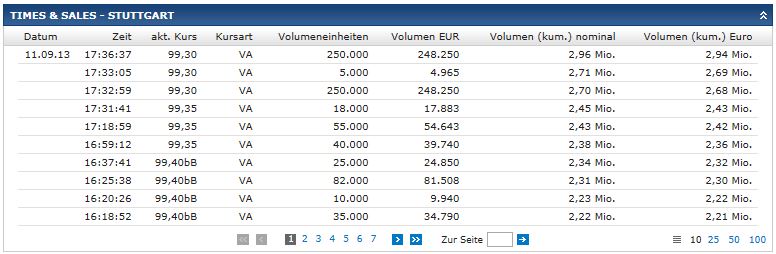 vanity September 11, 2013 ... der Kurs ist so wie ich es sehe ein Taxkurs ohne Volumen- was bedeutet denn das? Dass der Makler gerade Feierabend gemacht hat, weil er sein Tagessoll (3 Mio. Umsatz) erfüllt hat. In STU werden die Notierungen für Anleihen mehr oder weniger großzügig vor 18 Uhr ausgeblendet (im Gegensatz zu anderen Plätzen, bei denen die letzten Taxen über Nacht stehen bleiben), wenn der Handel beendet ist. Wer kann denn schon verkaufen, wenn er noch gar nicht gezeichnet hat, oder ist das eine reine Schätzung eines Kursmaklers? Im Gegensatz zu M-Bonds wird hier (und bei anderen ernstzunehmenden Emissionen) Privatanlegern keine Zeichnungsmöglichkeit geboten. Die Emission wird von Institutionellen übernommen und dann auf dem Sekundärmarkt platziert. Was heute in STU während der Handelszeiten zu sehen war, ist regulärer Handel, bei dem im Wesentlichen die inst. Erstzeichner als Anbieter auftreten. Das wird noch ein paar Tage so bleiben. Diesen Beitrag teilen Link zum Beitrag