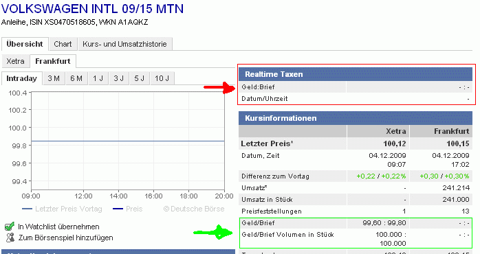 Die rot markierten Angaben, leider ohne Volumen, sind realtime. Die grün markierten - mit Volumen - hingegen sind zeitverzögert. Hier sieht man auch die Paralleldarstellung XETRA (links), Parkett (rechts) bei Börse FFM. (bei den anderen Börsenseiten kenne ich mich nicht so genau aus).