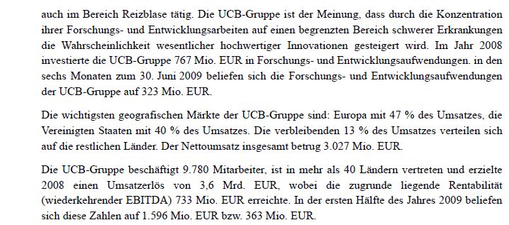 XYZ99 Dezember 16, 2009 ISIN BE6000480606 / WKN A1AQ00 Belgischer Pharma-Entwickler/Hersteller/Vertreiber UCB begibt eine Anleihe mit Kupon 5,75 % Ausgabe: 10.12.2009, Endfälligkeit 10.12.2016, immer mit 10.12. als Kupon-Termin Stückelung 1000 EUR, Vol 0,5 Mia Kündigung seitens des Gläubigers bei Kontrollwechsel und rating-Herabstufung möglich. Wenn diese Klausel im Frühjahr nicht von den Aktionären des Unternehmens durchgewunken wird, gibts einen 0,5 %igen step up, rückwirkend auf den Ausgabetag. Der Prospekt ist 151 Seiten stark und bei ucb erhältlich, ebenso eine deutsche Zusammenfassung --- link Hoffentlich macht die Länge des Prospekts keine Schule , dürfte die Anleihe nicht beliebter machen. Rating? Gibt wohl keins, das Unternehmen ist wohl schon junk-verdächtig. Vielleicht können wir hier noch was über diesen Laden zusammentragen. Ach ja Umsätze noch nicht soweit über 100 als dass es unverschämt wäre. Mein Kommentar: gab schon mal mehr Kupon für weniger lange Laufzeiten. Der Winter der Deflation scheint anzufangen und Rentiere haben es immer schwerer! Vielleicht lieber auf eine Zwischenwarmzeit setzen? Oder sich draufstürzen? Diesen Beitrag teilen Link zum Beitrag