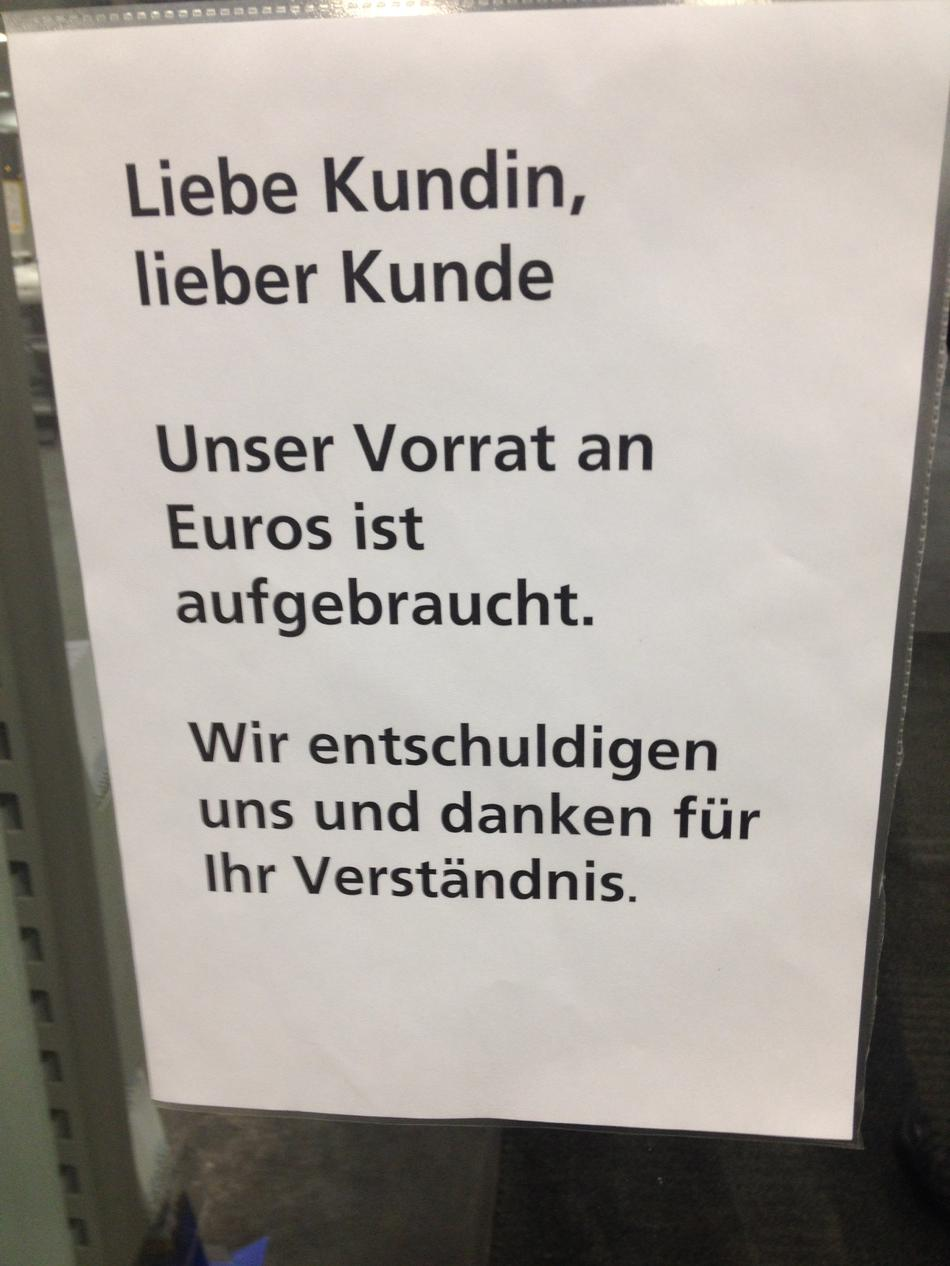 finisher Januar 16, 2015 heute an einer schweizer Bankfiliale Spekulieren die Leute auf eine Gegenbewegung, oder wieso tauschen die jetzt in Euros? Nein, Sie gehen damit am Wochenende in den Euro-Nachbarländern shoppen. Diesen Beitrag teilen Link zum Beitrag