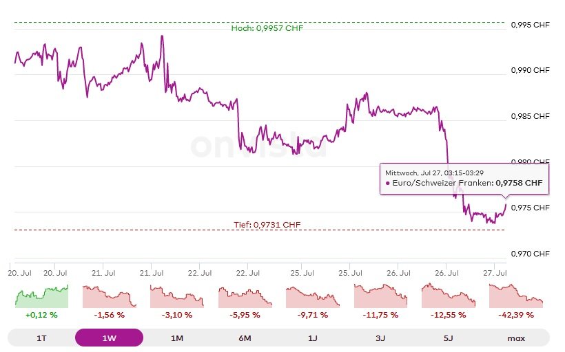 Heute gab es einen neuen Tiefstwert von 0,9941 CHF für den Euro, aktuell ist der Euro wieder ganz knapp über 1,00 CHF, aber die Kurse der Zahlungsdienstleister sind wahrscheinlich drunter.